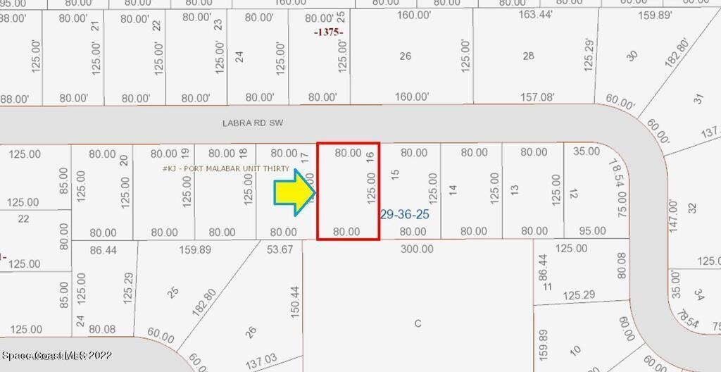 0.23 acre buildable residential lot available in Port Malabar Unit 30 of Palm Bay. Located in the southwest section, this lot is just 1.6 miles - 4 minutes to Westside Elementary School, 3.5 miles - 8 minutes to the Publix Supermarket, 15.4 miles - 32 minutes to Melbourne Airport, and 20.1 miles - 34 minutes to the beaches of Indialantic. From exit #176 of I-95 go west on Palm Bay Road for .7 miles, left on Minton Road for 3.3 miles, right on Jupiter Boulevard for .1 mile, left on DeGroodt Road for 4.3 miles, and right on Labra Road. The lot will be on your left.