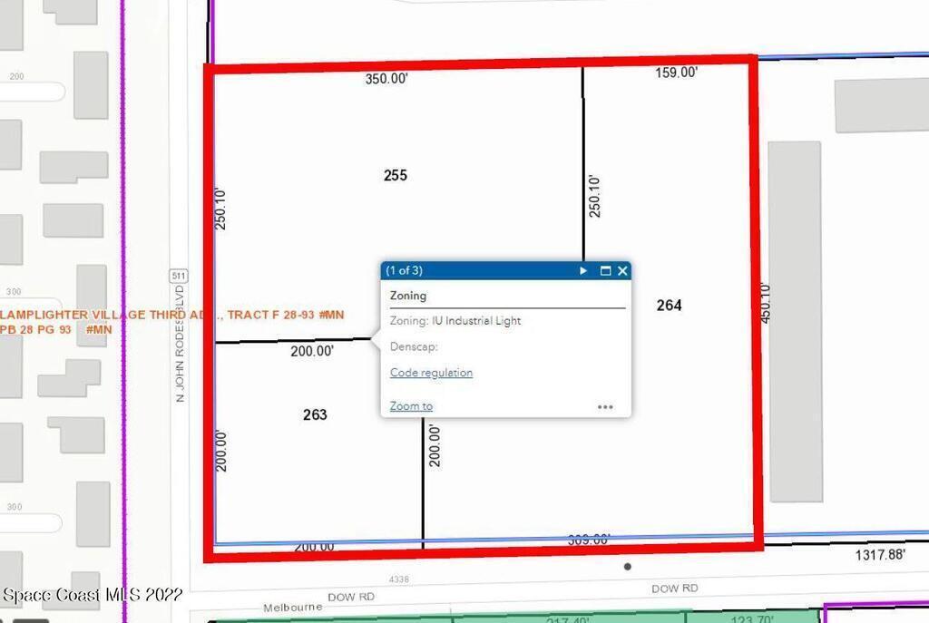 One of the last pieces of industrial land in the Melbourne area! Subject Property is 5.26 Acres total with estimated 509' Frontage on Dow Road x estimated 450' frontage on John Rodes Boulevard. Zoning is Brevard County (IU) which allows Manufacturing, Assembly, Automobile, Warehousing & More!! There are City of Melbourne Water & Sewer lines on both Dow Road & John Rodes Boulevard. Subject Property is located approximately halfway between Ellis Road & Eau Gallie Boulevard with two Interstate 95 interchanges within a 2-mile radius!! Close proximity to the Melbourne International Airport, L3Harris, Amazon, and all of the other restaurants, daycare, and amenities that the area has to offer. Make this the future home for your business today!