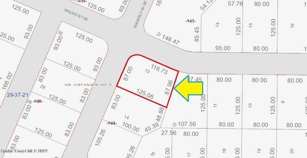 0.24 acre buildable residential lot available in Port Malabar Unit 18 of Palm Bay. Located in the southeast section, this corner lot is just 2.9 miles - 7 minutes to the Publix Supermarket, 4.2 miles - 9 minutes to Bayside High School, 11 miles - 21 minutes to Melbourne Airport, and 13 miles - 24 minutes to the beaches of Indialantic. From exit #173 of I-95 go west on Malabar Road for .2 miles, left on San Filippo Drive for 3.6 miles, and left on Waldo Street. The lot will be on your right on the corner at Waverly Avenue.