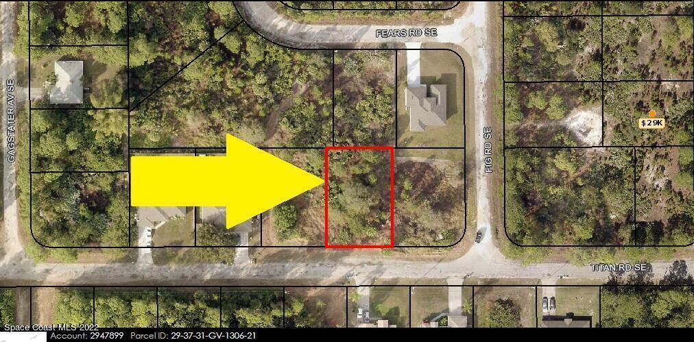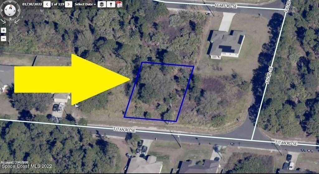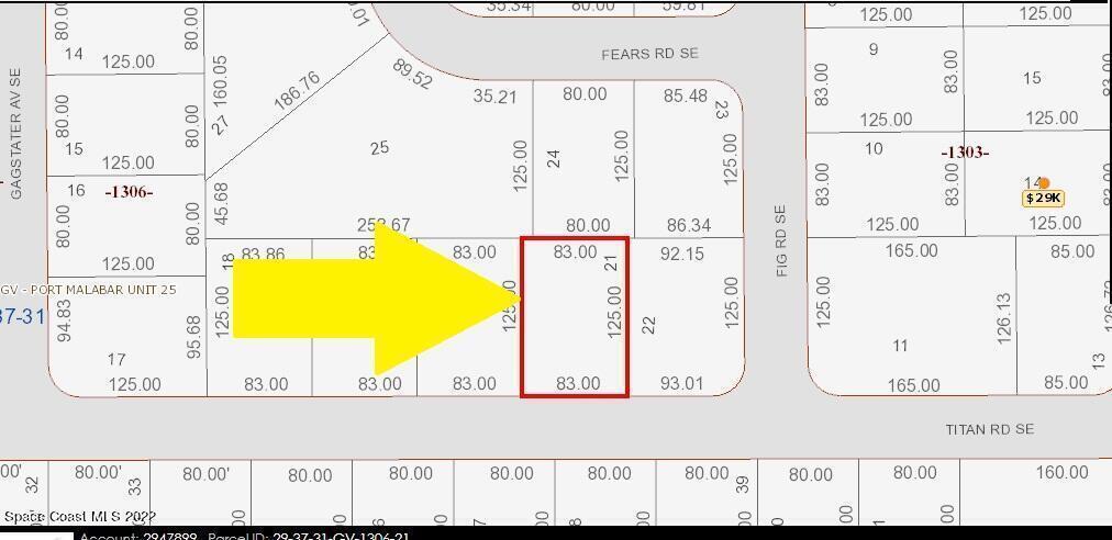 Newly paved roads !!! 0.24 buildable single family residential lot [one from the corner] available in Port Malabar Unit #25 of Palm Bay. Located in the southeast section near Bayside Lakes, this lot is just 4.2 - 9 minutes to Publix Shopping Market, 3.1 miles - 6 minutes to Bayside High School,15.0 miles - 35 minutes to Melbourne International Airport, and 17.5 miles - 43 minutes to the beaches of Indialantic. From Exit #173 of I-95 go west on Malabar Road. Turn left on San Filippo Drive SE and proceed south for 6.8 miles. Turn left on Flagstaff Avenue SE and right on Titan Road SE. The lot will be on the right.