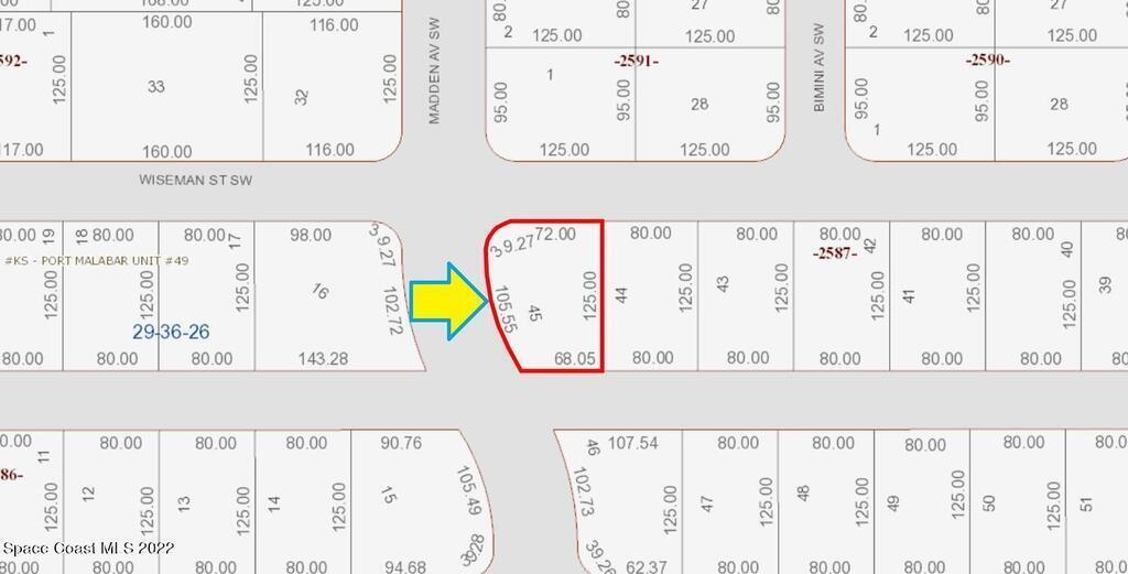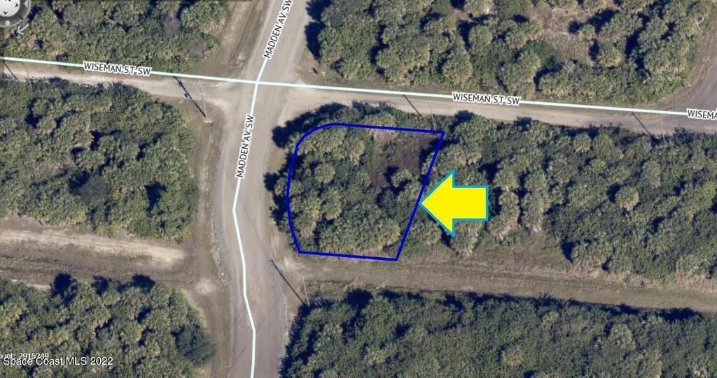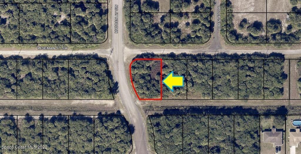 0.25 acre buildable residential corner lot available in Port Malabar Unit 49 of Palm Bay. Located in the southwest section, this lot has a drainage canal in the rear allowing more privacy, and is just 1.8 miles - 5 minutes to Westside Elementary School, 3,7 miles - 9 minutes to the Publix Supermarket, 15.2 miles - 33 minutes to Melbourne Airport, 18 miles - 39 minutes to the beaches of Indialantic. From exit #176 of I-95 go west on Palm Bay Road for .7 miles, left on Minton Road for 3.3 miles, right on Jupiter Boulevard, left on DeGroodt Road for 3.3 miles, right on Osmosis Drive for 1.0 mile, left on Madden Avenue for .3 miles, and left on Wiseman Street. The lot will be on your right on the southeast corner with Madden.