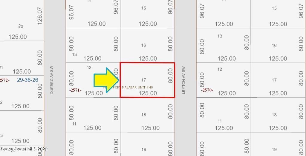 0,23 acre buildable residential lot available in Port Malabar Unit 49 of Palm Bay. Located in the southwest section, this lot is just 2.1 miles - 6 minutes to Westside Elementary School, 4 miles - 9 minutes to the Publix Supermarket, 15.4 miles - 34 minutes to Melbourne Airport, and 21.7 miles - 39 minutes to the beaches of Indialantic. From exit #176 of I-95 go west on Palm Bay Road for .7 miles, left on Minton Road for 3.3 miles, right on Jupiter Boulevard, Left on DeGroodt Road for 3.3 miles, right on Osmosis Drive for 1.0 mile, left on Madden Avenue for .7 miles, left on Hurricane Street for .2 miles, and right on Leyton Avenue. The lot will be on your right.