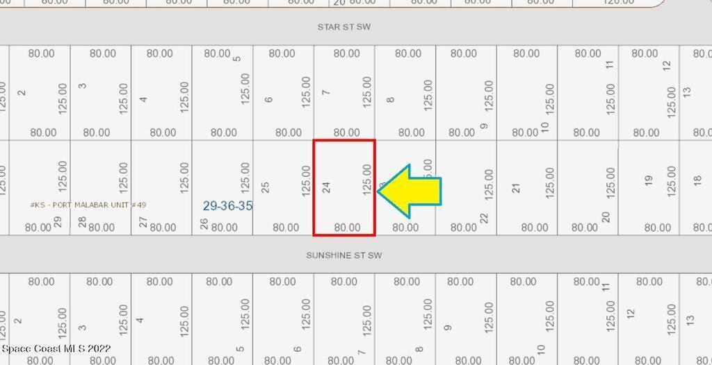 0.23 acre buildable residential lot available in Port Malabar Unit 49 of Palm Bay. Located in the southwest section, this lot is just 3.5 miles - 8 minutes to Westside Elementary School, 5.4 miles - 11 minutes to the Publix Supermarket, 16.7 miles - 33 minutes to Melbourne Airport, and 18.6 miles - 37 minutes to the beaches of Indialantic. From exit #176 of I-95 go west on Palm Bay Road for .7 miles, left on Minton Road for 3.3 miles, right on Jupiter Boulevard, left on DeGroodt Road for 4.6 miles, right on St Andre Boulevard for 1.2 miles, right on Madden Avenue for .2 miles, right on Opal Street, left on Libby Avenue, and right on Sunshine Street. The lot will be on your left.