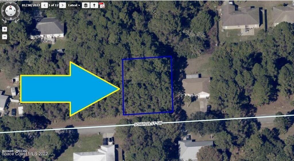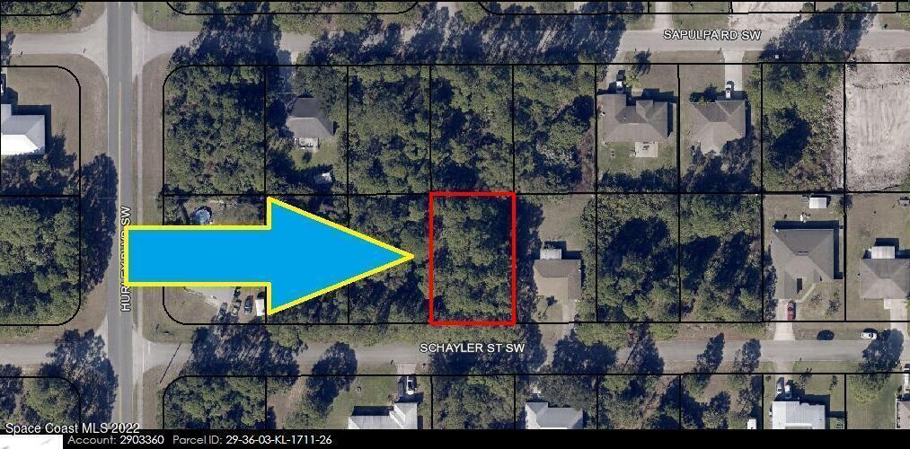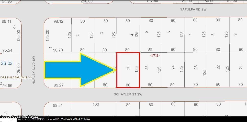 0.23 acre buildable single family residential lot [Rs2 Zoning] available in Port Malabar Unit 36 of Palm Bay. Located in the southwest section, this lot is just 1.2 miles - 4 minutes to Jupiter Elementary School, 2.5 miles - 6 minutes to the Winn Dixie Supermarket, 12.4 miles - 27 minutes to Melbourne Airport, and 15 miles - 33 minutes to the beaches of Indialantic. From exit#176 of I-95 go west on Palm Bay Road for .7 miles, left on Minton Road for 2.5 miles, right on Malabar Road for 2.2 miles, left on Hurley Boulevard for .4 miles, and left on Schayler Street. The lot will be on your left.