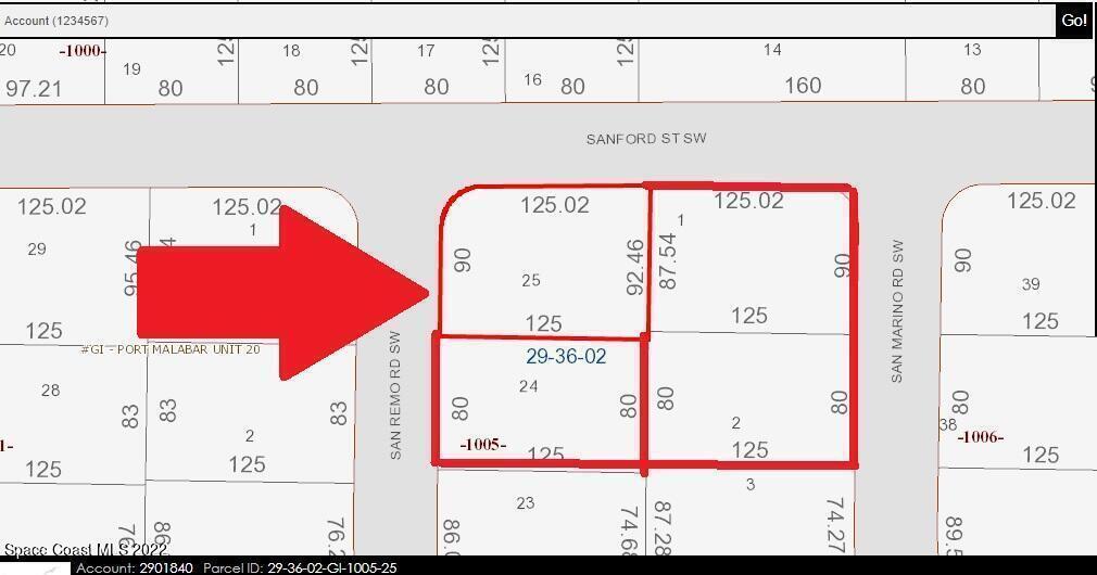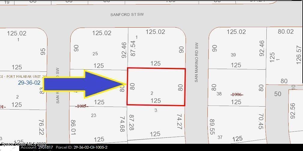 4 side-by-side adjacent single family residential lots [Rs2 zoning}] available in Port Malabar Unit #20. The four lots are 2-corners and 2 interiors forming a 1-acre square!! Nicely located in the SW Section, this lot is just 3.9 miles -9 minutes- to Publix Shopping and the Shoppes of Palm Bay, 1 miles -3 minutes- to Jupiter Elementary School, 8.4 miles -16 minutes- to the Melbourne Square Mall, and just 13.8 miles -27 minutes- to the beaches of Indialantic. From Exit 176 of I-95 go west on Palm Bay Road NE. Turn left on Minton Road and go south for 2.5 miles. Turn right on Malabar Road and proceed west for 1.3 miles. Turn left on Wellsley Avenue SW and right on Sanford Street. The lots are on San Remo and San Marino and make up the first 4 lots on the top of the block