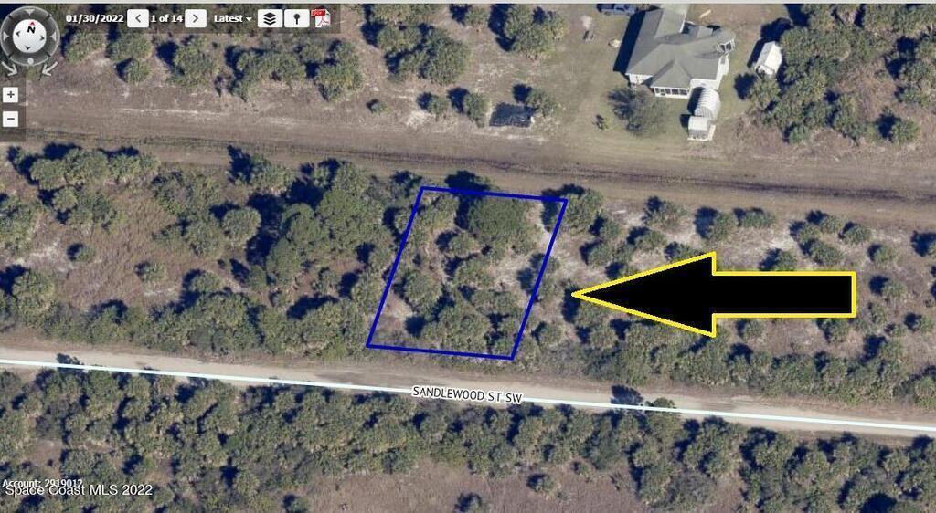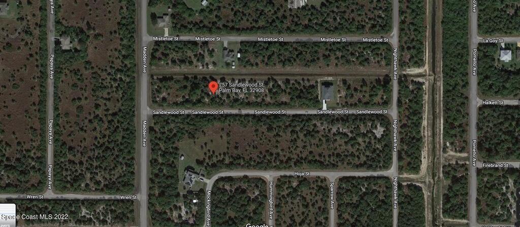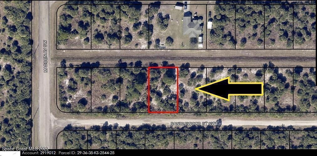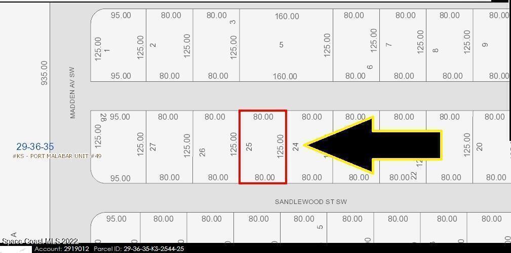 0.23 acre buildable single family residential lot [Rs2 Zoning] available in Port Malabar Unit #49 of Palm Bay. Located in the southwest section, this lot has a drainage canal in the rear allowing more privacy, and is just 3.7 miles - 8 minutes to Westside Elementary School, 5 miles - 10 minutes to the Publix Supermarket, 16.7 miles - 33 minutes to Melbourne Airport, and 18.2 miles - 37 minutes to the beaches of Indialantic. From exit #176 of I-95 go west on Palm Bay Road for .7 miles, left on Minton Road for 3.3 miles, right on Jupiter Boulevard for .1 mile, left on DeGroodt Road for 4.6 miles, right on St. Andre Boulevard for 1.2 miles, left on Madden Road for .2 miles, and left on Sandlewood Street. The lot will be on your left.
