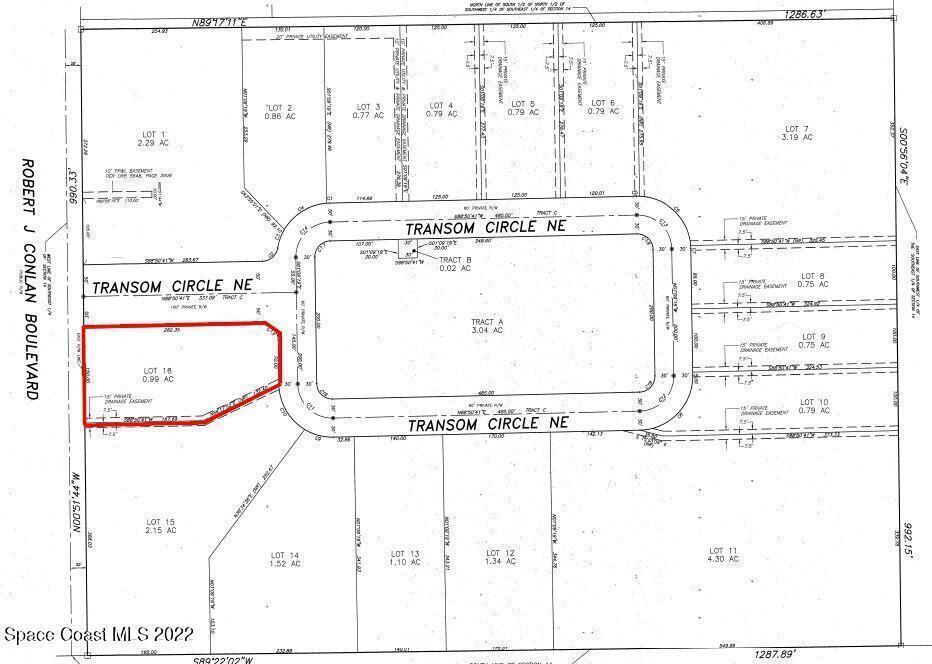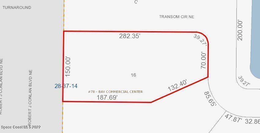 Vacant industrial land for sale in the HEART of Palm Bay. Lot 16 is located at the southern intersection of Robert J. Conlan Boulevard NE & Transom Circle. Lot 16 is +/- 0.99 Acres. Asking $395,000. Property is zoned City of Palm Bay Light Industrial (LI) which allows Light Manufacturing, Light Assembly, Warehousing, Outdoor Storage & More! Frontage on Robert J. Conlan Boulevard which has exposure to estimated 16,800 VPD! City Water/Sewer & FPL are available nearby. Surrounding neighbors include L3Harris, Northrop Grumman, Raytheon, UPS & More! Seller will consider financing subject to Contract Terms & Buyer Credit. Make this the future home for your business today!
