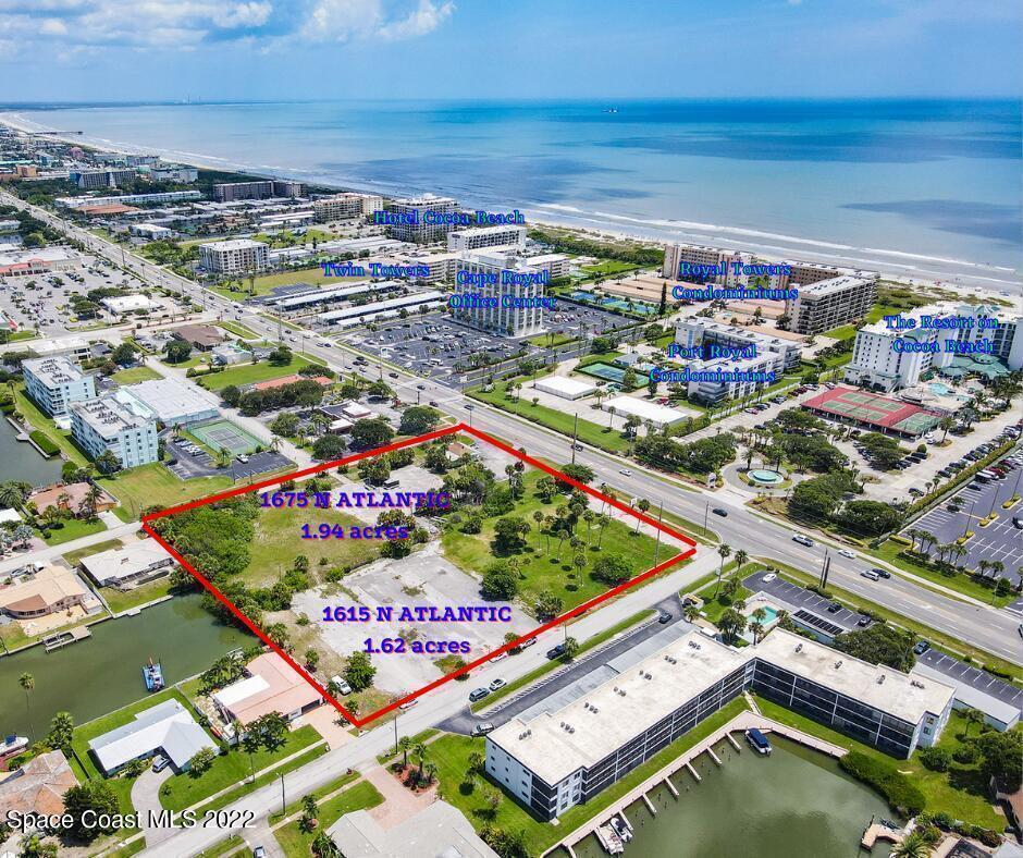 One of the last multi-acre parcels on Cocoa Beach. OVER 3.5 ACRES IN THE HEART OF COCOA BEACH with approximately 375' frontage on Hwy. A1A between Bimini Rd (440'' frontage) & Jamaica Dr (430' frontage) & western boundary of 110' waterfront. Parcel combined w/ 1675 N. Atlantic Ave. ML# (Tax Acct 2513816). Zoned RM-2 multi family-professional/restaurant-retail. 30,210 daily traffic count. Cocoa Water / Cocoa Beach Sewer are available to the site along Atlantic Avenue. The area surrounding the property consists primarily of multi-family housing (apartments and condominiums), resort hotels, small business, and single family homes. COMBINED PARCEL SIZE OFFERS RARE DEVELOPMENT OPPORTUNITY IN ICONIC COCOA BEACH. COMBINED CLOSED SALES PRICE OF BOTH PARCELS IS $2,856,790 FOR 1615 & 1675 N ATLAN