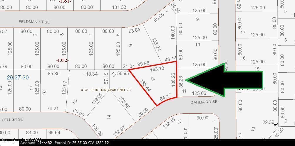 1 of 2 Side-by-Side Adjacent single family residential lots (0.58 acres total) available in Port Malabar Unit #25 of Palm Bay. Beautifully located in the SE Section near Bayside Lakes Subdivision, these lots are just 4.3 miles -10 minute- to Publix Shopping, 3 miles -6 minutes- to Bayside High and Westside Elementary Schools, 7.9 miles -16 minutes- to the Shoppes of Palm Bay, 15.5 miles -36 minutes- to Melbourne International Airport and just 19.9 miles -35 minutes- to the beaches in Indialantic. From Exit #173 of I-95 go west on Malabar Road. Turn left on San Filippo Drive SE and proceed south for 5.7 miles. Turn right on Cogan Drive, Left on Paigo Street SE, right on Freehold Avenue SE, Left on Latham Street SE, Right on Feldman Street SE, Left on Daisy, and right on Dahlia on right.