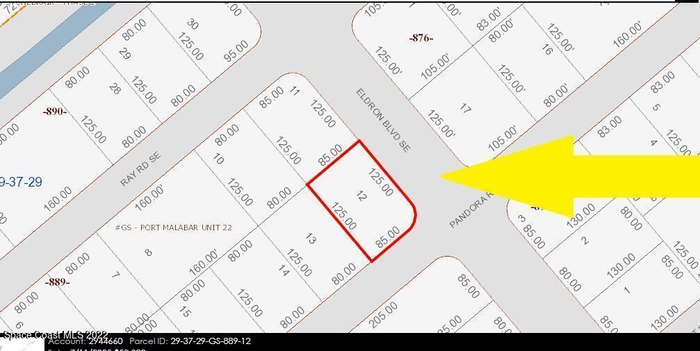 0.24 acre residential CORNER lot (Rs2 Zoning) available in Port Malabar Unit #22 of Palm Bay. This lot is located in the SE Section of Palm Bay just south of Bayside Lakes Subdivision and the PGA Majors Golf Course, and conveniently located near Publix Shopping and newer residential homes. From Exit #173 of I-95 go west on Malabar Road NE. Turn left on San Filippo Drive SE and proceed south for 4.8 miles. Turn right on Eldron Boulevard and proceed for 0.5 miles to the corner on Pandora.