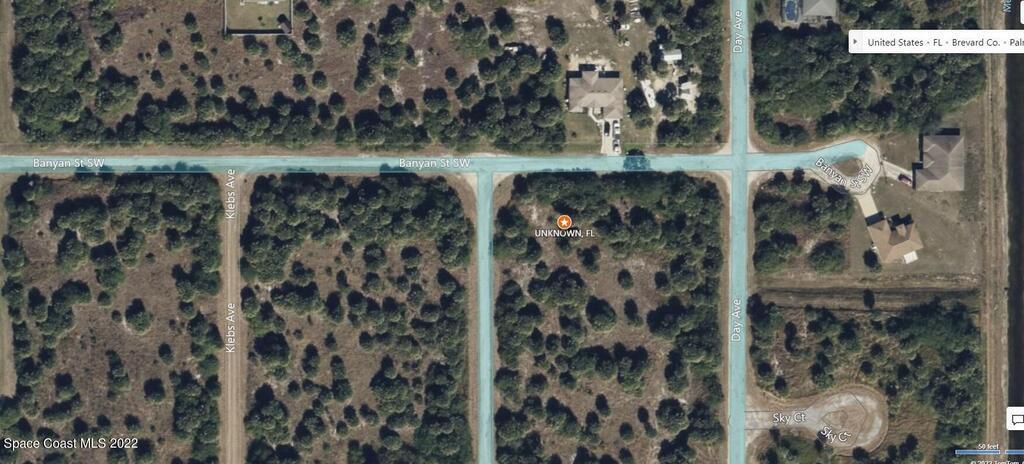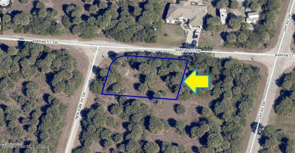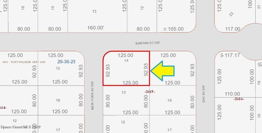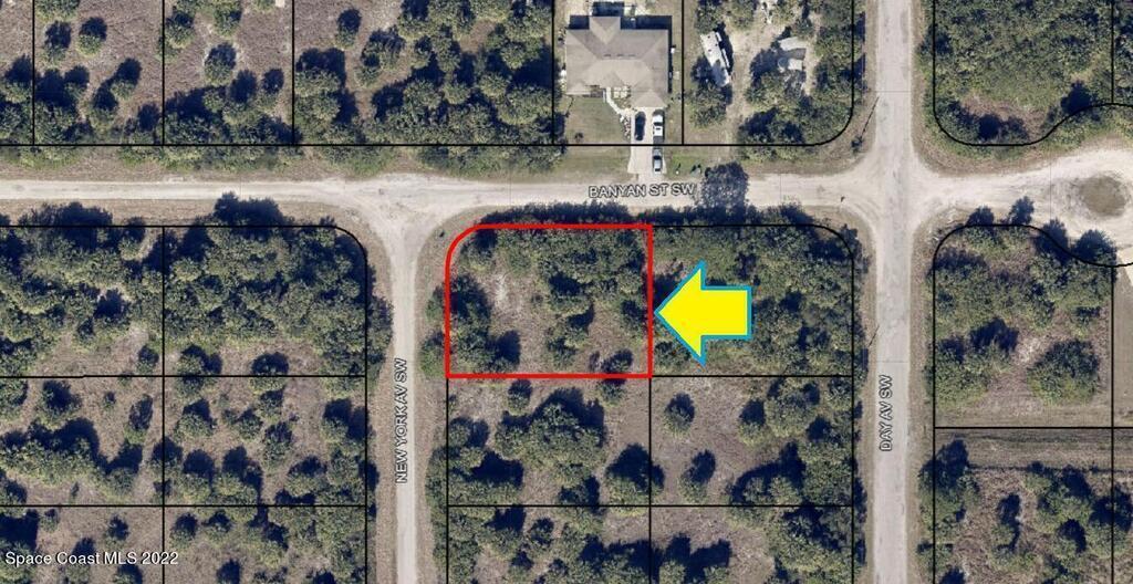 One of 2 side-by-side adjacent lots available in Port Malabar Unit 49 of Palm Bay. Located in the southwest section, this 0.27 acre buildable residential Cornerlot is just 1.1 miles - 3 minutes to Bayside High School, 2.4 miles - 6 minutes to the Publix Supermarket, 14 miles - 29 minutes to Melbourne Airport, and 16.7 miles - 34 minutes to the beaches of Indialantic. From exit #176 of I-95 go west on Palm Bay Road for .7 miles, left on Minton Road for 3.3 miles, right on Jupiter Boulevard, left on DeGroodt Road for 2.5 miles, right on JA Bombardier Boulevard for .7 miles, left on Day Avenue, right on Banyan Street, and left on New York Avenue. The lot will be on your left on the southeast corner.