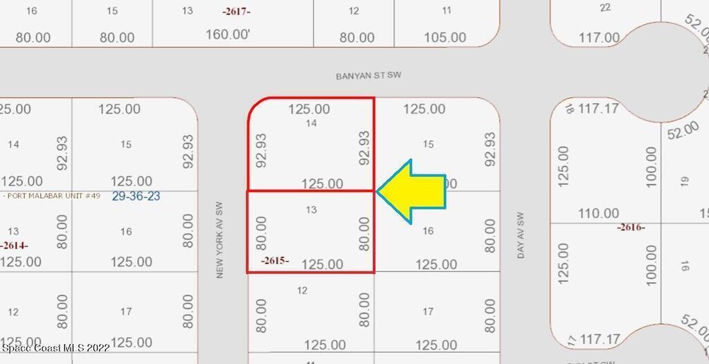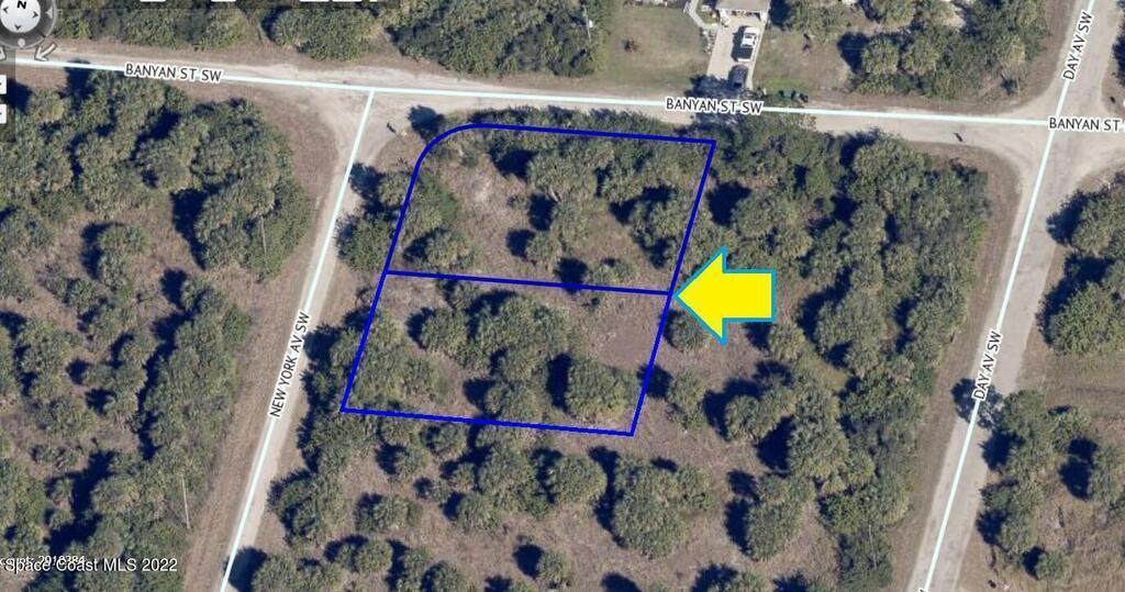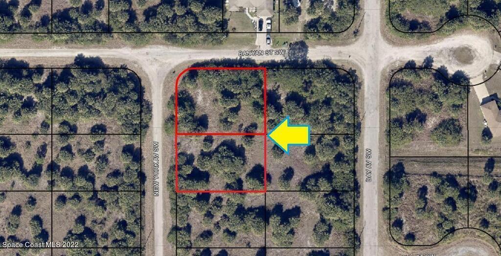 0.50 acre buildable residential Corner lot available in Port Malabar Unit 49 of Palm Bay. Located in the southwest section, this lot is just 1.1 miles - 3 minutes to Bayside High School, 2.4 miles - 6 minutes to the Publix Supermarket, 14 miles - 29 minutes to Melbourne Airport, and 16.7 miles - 34 minutes to the beaches of Indialantic. From exit #176 of I-95 go west on Palm Bay Road for .7 miles, left on Minton Road for 3.3 miles, right on Jupiter Boulevard, left on DeGroodt Road for 2.5 miles, right on JA Bombardier Boulevard for .7 miles, left on Day Avenue, right on Banyan Street, and left to New York Avenue. The lot will be on your left on the southeast corner.