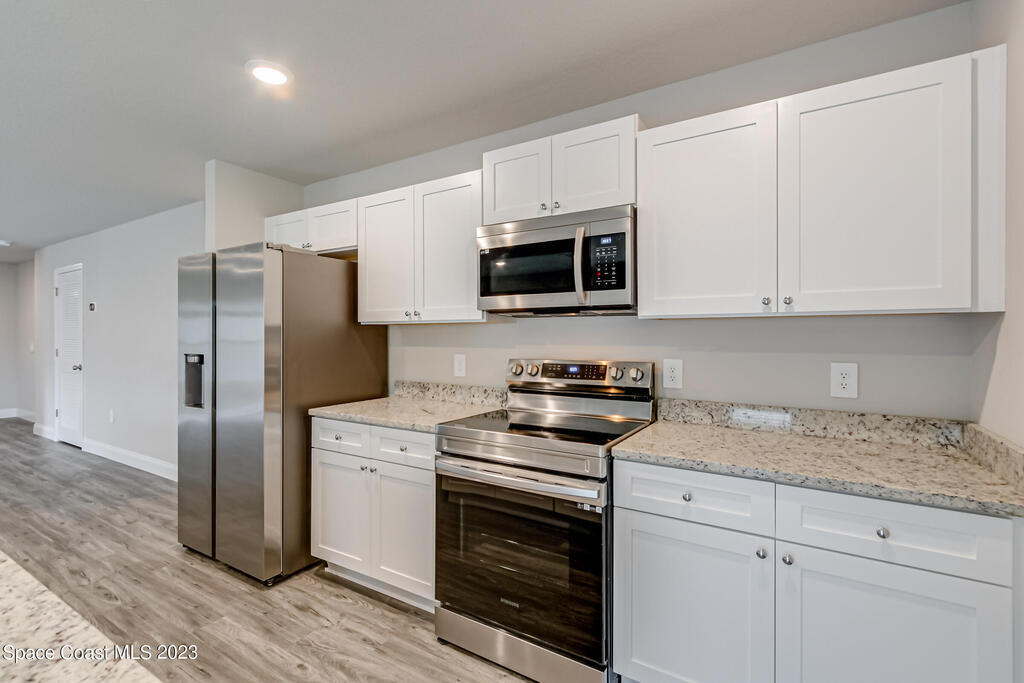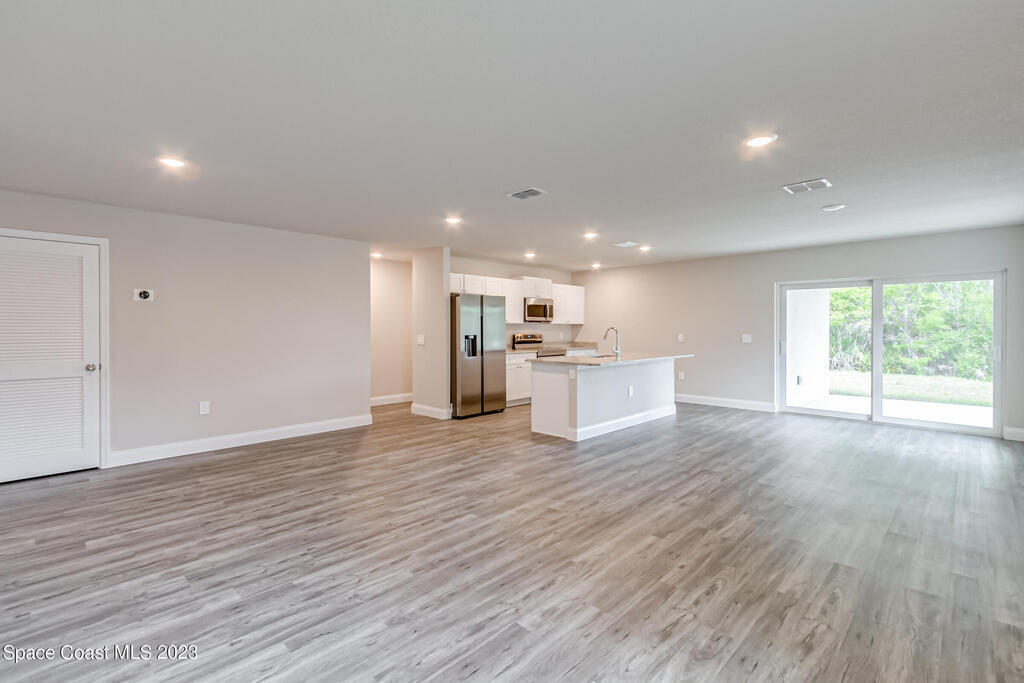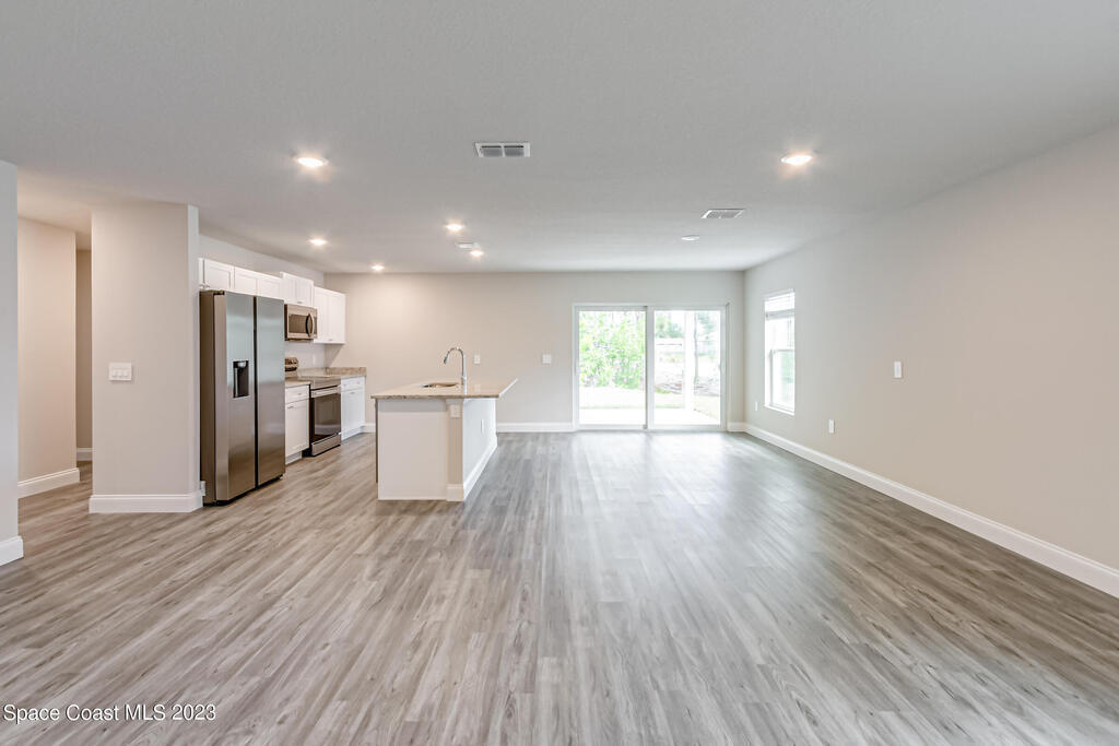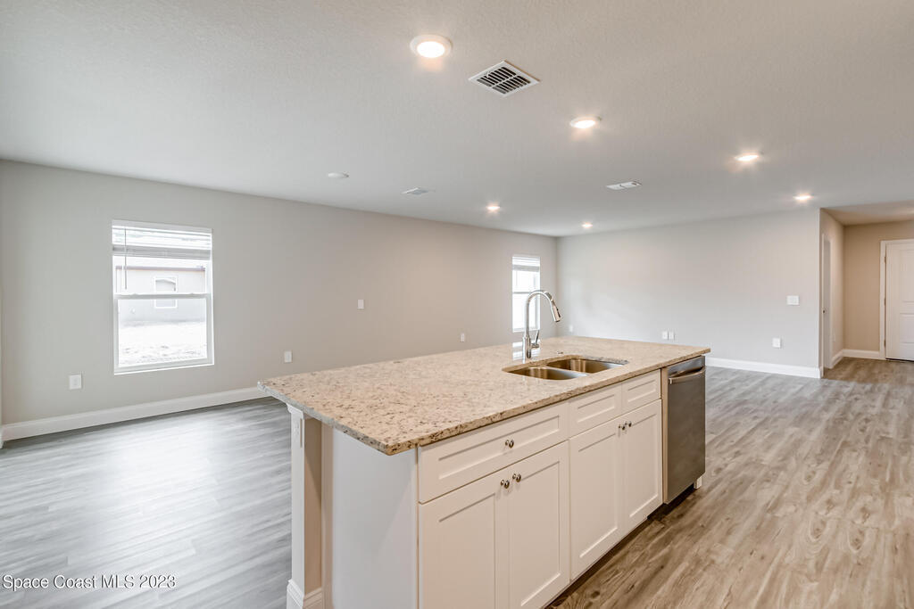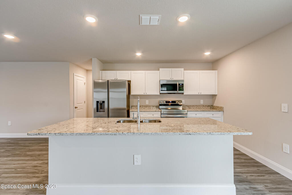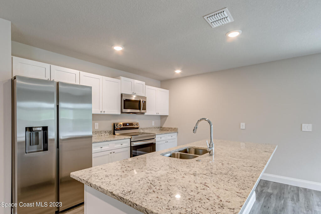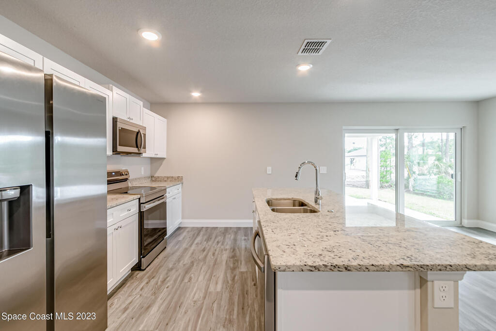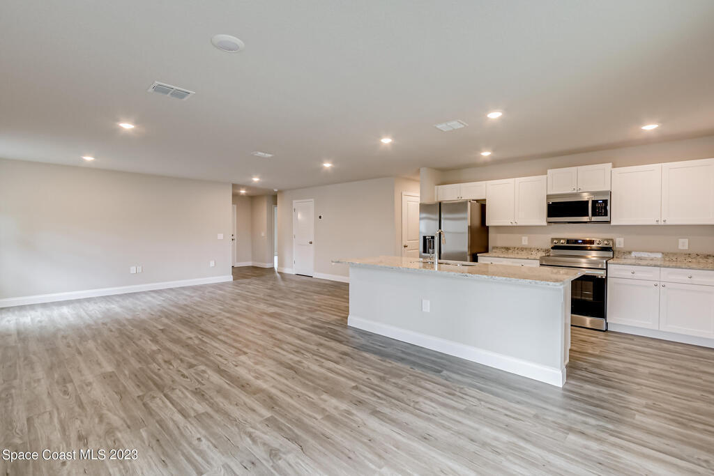 Beautiful open floor plan with 4 beds/2 baths and luxury features! Quartz counters, white sharker cabinets, luxury vinyl plank flooring throughout & all stainless-steel appliances! The well-lit Foyer with a convenient coat closet offers a nice view of the living area-open to the Kitchen and Great Room area. Sliding glass doors, to the covered lanai, bringing the outdoors in. The kitchen offers an open island with seating and nice size Pantry.A private Master Suite is tucked in the front of the home with dual walk-in closets with an ensuite bath. The Guest Bedrooms start at the rear of the home and share a full bath between them. The hallway connecting the two bedrooms offers both a Laundry Room and a generous Linen closet.