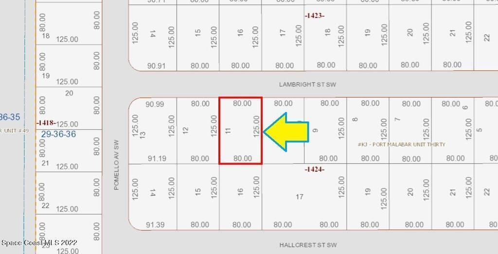 0.23 acre buildable residential lot available in Port Malabar Unit 30 of Palm Bay. Located in the southwest section, this lot is just 2.2 miles - 7 minutes to Westside Elementary School, 4.9 miles - 12 minutes to the Publix Supermarket, 16.2 miles - 36 minutes to Melbourne Airport, and 21 miles - 37 minutes to the beaches of Indialantic. From exit #176 of I-95 go west on Palm Bay Road for .7 miles, left on Minton Road for 3.3 miles, right on Jupiter Boulevard, left on DeGroodt Road for 4.6 miles, right on St Andre Boulevard for .9 miles, right on Pomello Avenue for .3 miles, and right on Lambright Street. The lot will be on your right.