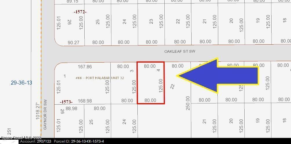 0.23 acre builldable single family residential interior lot available in Port Malabar Unit #32 of Palm Bay. Nicely located in the SW section, this property is just 2.8 miles -7 minutes- to Publix Shopping, 1.5 miles -4 minutes-to Bayside High and Westside Elementary Schools, 4.5 miles -10 minutes- to the famous Compound Area, 12.5 miles -29 minutes- to the Melbourne Int'l Airport, and just 15.2 miles -34 minutes- to the beaches in Indialantic. From Exit #176 of I-95 go west on Palm Bay Road NE. Turn left on Minton Road and proceed south for 3.3 miles. turn right on Jupiter Boulevard SW and left on DeGroodt Road SW. Proceed south for 1.5 miles and turn right on Saxony Road SW, Left on La Croix Road SW, left on Platt Avenue SW and right on Oakleaf Street SW. The lot will be on the left.