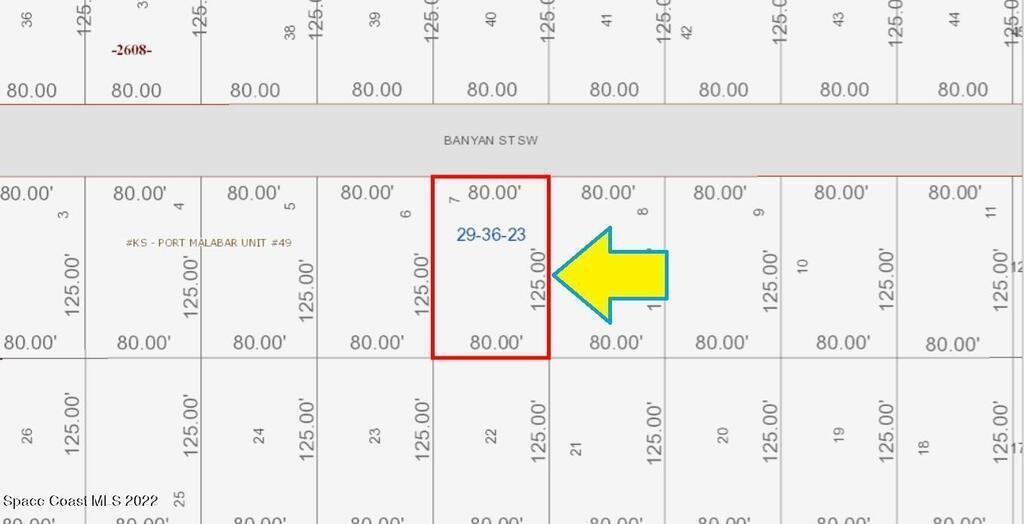 One of 2 side-by-side adjacent lots available in Port Malabar Unit 49 of Palm Bay (the other is 816 Banyan). Located in the southwest section, this buildable residential lot is just 1.3 miles - 4 minutes to Bayside High School, 2.5 miles - 7 minutes to the Publix Supermarket, 14 miles - 32 minutes to Melbourne Airport, and 17 miles - 38 minutes to the beaches of Indialantic. From exit #176 of I-95 go west on Palm Bay Road for .7 miles, left on Minton Road for 3.3 miles, right on Jupiter Boulevard, left on DeGroodt Road for 2.5 miles, right on J.A. Bombardier Boulevard for .9 miles, left on Madden Avenue for.1 mile, and right on Banyan Street. The lot will be on your left.