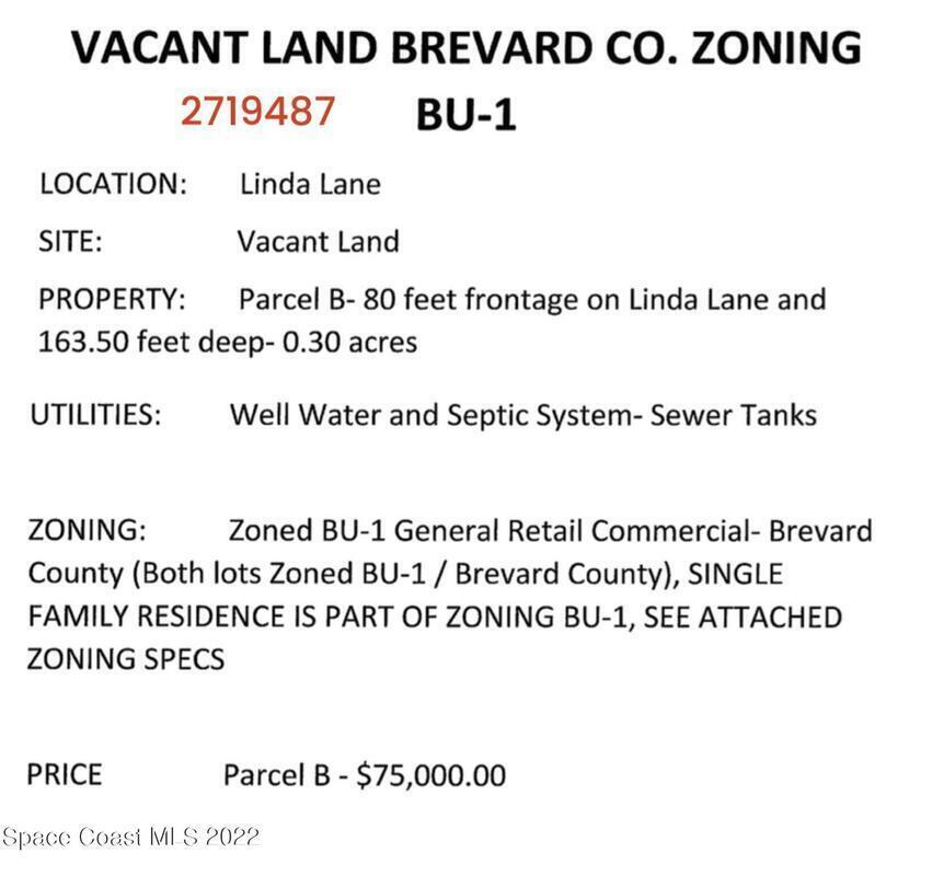 Are you seeking Commercial or Residential Vacant Land in Brevard County? This lot has options! Build Your Business or YOUR HOME! BU-1 Zoning allows many uses From Retail, Professional Office, Residential but not limited to! For a complete list of your OPTIONS see attached Docs or Call List Agent for more details.Zoning: This lot is Zoned BU-1 General Commercial / w SINGLE FAMILY RESIDENCE being a part of Zoning BU-1. See attached zoning specs for further details. *NOTE Seller is also selling PARCEL C - MLS# 954526 - same specs as this parcel. *PB Details: Vacant Land Parcel B - 80 Feet Frontage on Linda Lane in Eau Gallie Florida Brevard County and 163.50 Feet Deep - 0.30 Acres