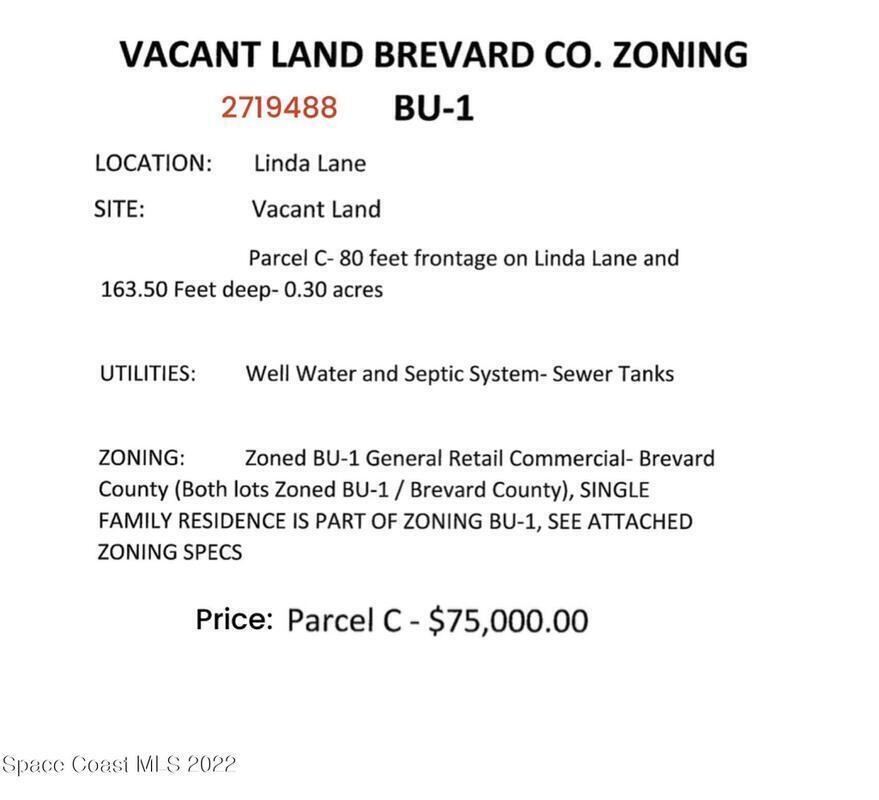 Are you seeking Commercial or Residential Vacant Land in Brevard County? This lot has options! Build Your Business or YOUR HOME! BU-1 Zoning allows many uses From Retail, Professional Office, Residential but not limited to! For a complete list of your OPTIONS see attached Docs or Call List Agent for more details.Zoning: This lot is Zoned BU-1 General Commercial / w SINGLE FAMILY RESIDENCE being a part of Zoning BU-1. See attached zoning specs for further details. *NOTE Seller is also selling PARCEL B - MLS# 954521 same specs as this parcel. *PC Details: Vacant Land Parcel C - 80 Feet Frontage on Linda Lane in Eau Gallie Florida Brevard County and 163.50 Feet Deep - 0.30 Acres