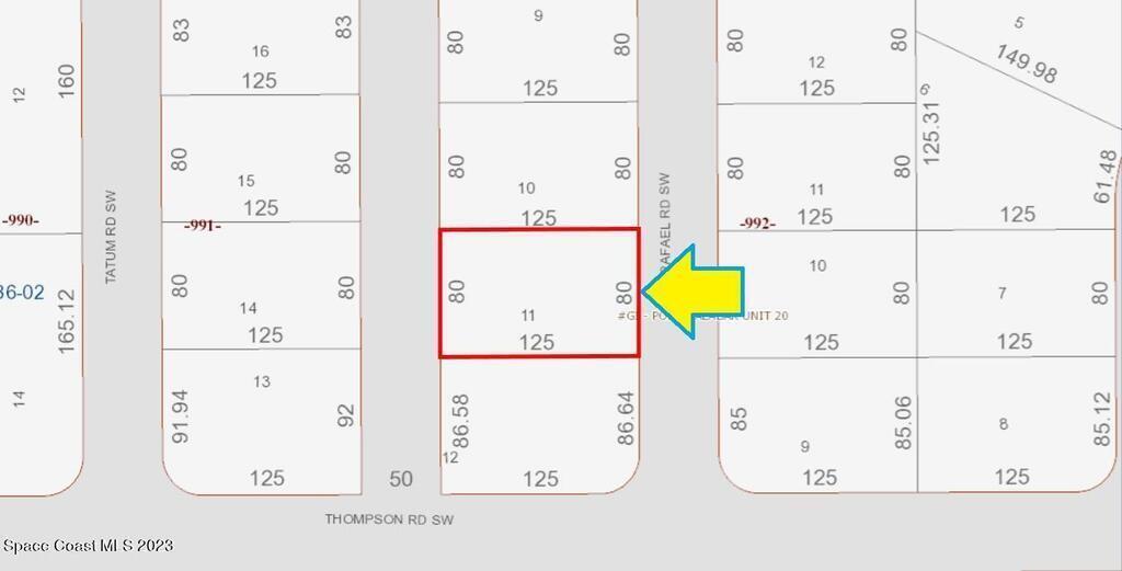 0.23 acre buildable residential lot available in Port Malabar Unit 20 of Palm Bay. Located in the southwest section, this lot has a drainage canal in the rear allowing more privacy, and is just 1.1 miles - 4 minutes to Jupiter Elementary School, 2 miles - 5 minutes to the Winn Dixie Supermarket, 11.5 miles - 25 minutes to Melbourne Airport, and 14.4 miles - 30 minutes to the beaches of Indialantic. From exit #180 of I-95 go west on US-192 for .5 miles, left on St Johns Heritage Parkway for 6.1 miles, left on Malabar Road for 2.5 miles, right on Jupiter Boulevard for .3 miles and right on San Rafael Road. The lot will be on your right.