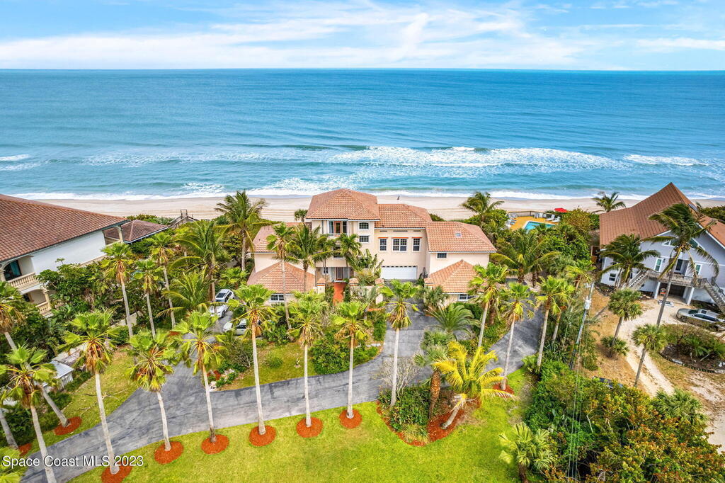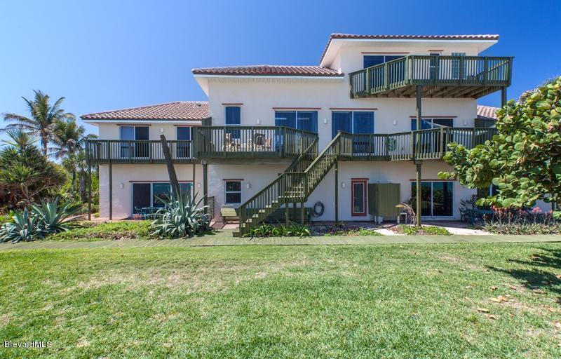 SEASIDE ESCAPE is a one of a kind, 1.36 acre property w/ 165 ft of pristine, South Melbourne Beach direct Ocean frontage. Tropical, private setting, set back from A1A, with multiple use options. Main home features 4 bed/3 Baths with open living area, an oversized 2 car garage, dramatic 700 sq ft Master Suite w/ balconies on the East and West side and 2 large Oceanfront balconies off the main level. The two side unit townhomes are each 2 bed / 2 bath with single car private garages and Oceanside balconies for each. Gigantic, Oceanfront pool w/ heated spa and a large deck area. Live in main home and rent out the other two, rent out all three for max income potential OR have an incredible family estate ! Shown by appointment only.