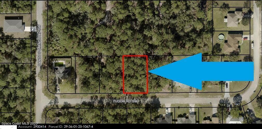 One of 2 side-by-side residential buildable lots available in Port Malabar Unit 19 of Palm Bay (the other is 181 Tudor). Conveniently located in the southwest section, this 0.23 acre lot is just 1.6 miles - 6 minutes to the Winn Dixie Supermarket, 2.2 miles - 6 minutes to Jupiter Elementary School, 11 miles - 26 minutes to Melbourne Airport, and 13.9 miles - 32 minutes to the beaches of Indialantic. From exit #176 of I-95 go west on Palm Bay Road for .7 miles, left on Minton Road for 3.3 miles, right on Jupiter Boulevard for .2 miles, right on Santo Domingo Avenue for .4 miles, and right on Tudor Road. The lot will be on your left.