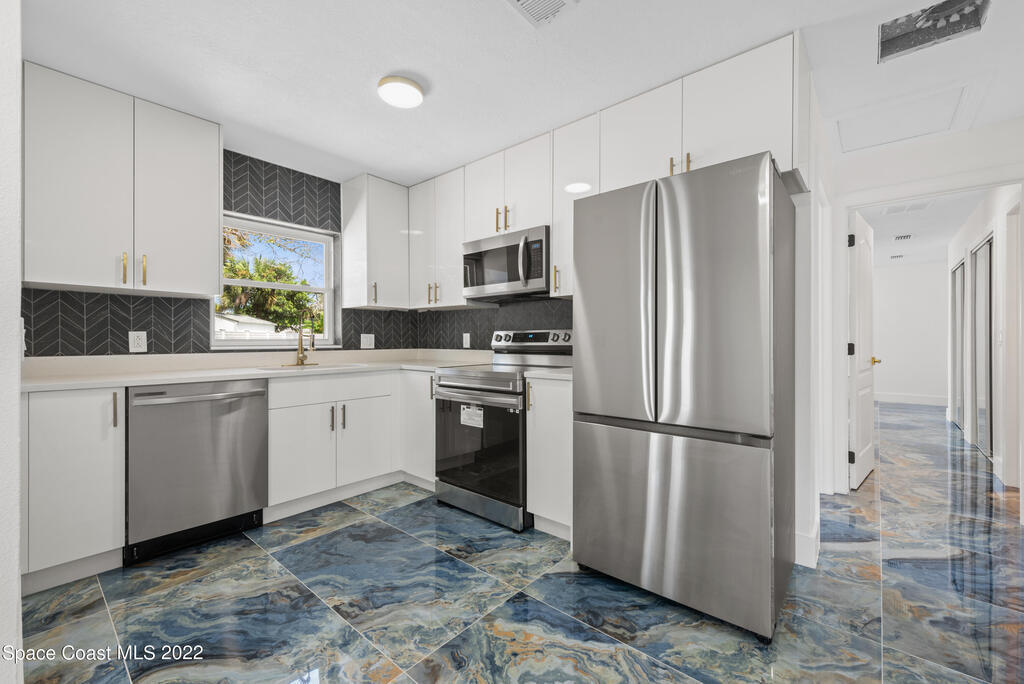 GREAT INVESTMENT in Luxury coastal lifestyle and near Melbourne Beach Florida is located this beautiful Home with walking distance to beach, ramp access of the Indian River, near golf course, schools & entertainments offers a completely REMODELED and UPGRADED in July of 2022 with high quality materials and design. New metal roof galvanized striated panel matt black finishing, New AC ducts, Satin white interior paint and premium sterling gray paint and Marino blue accents, the main part of the property has 3 bedrooms and 2 New bathrooms with Calacatta gray wall tile, frameless shower doors with luxury gold clips system and accessories, New full kitchen frameless wood cabinet European style with gold handles. Samsun & LG modern appliances.