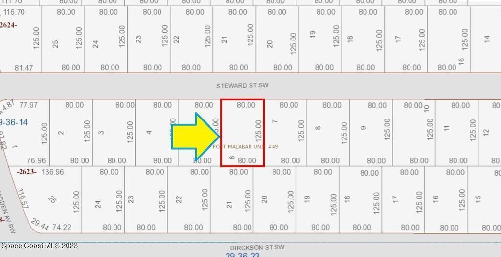 0.23 acre buildable residential lot available in Port Malabar Unit 49 of Palm Bay. Located in the southwest section, this lot is just 1.4 miles - 4 minutes to Bayside High School, 2.7 miles - 7 minutes to the Publix Supermarket, 14.4 miles - 30 minutes to Melbourne Airport, and 17 miles - 36 minutes to the beaches of Indialantic. From exit #176 of I-95 go west on Palm Bay Road for .7 miles, left on Minton Road for 3.3 miles, right on Jupiter Boulevard, left on DeGroodt Road for 2.5 miles, right on J.A. Bombardier Boulevard for .9 miles, right on Madden Avenue for .2 miles, and right on Steward Street. The lot will be on your right.