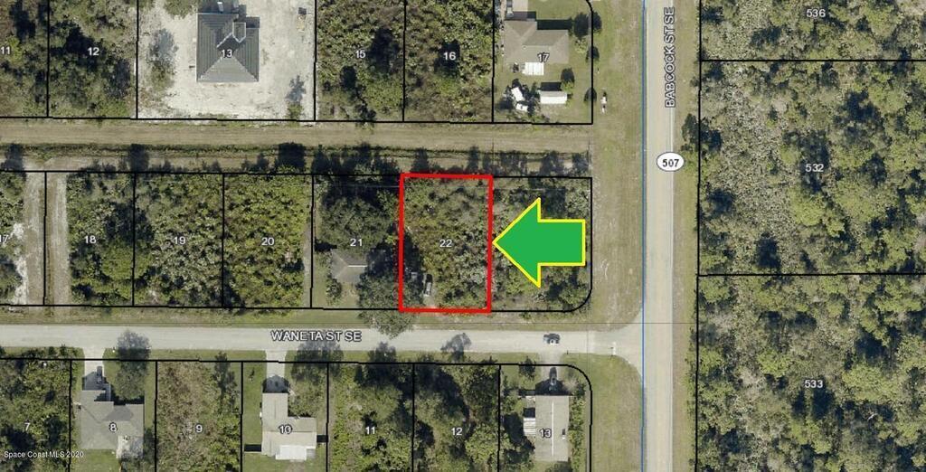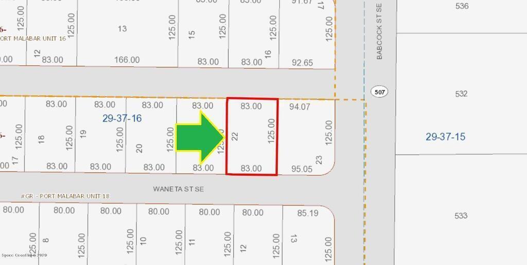 0.24 acre buildable single family residential lot available in Port Malabar Unit #18 of PalmBay. Located in the southeast section, this lot has a drainage canal in the rear allowing more privacy, and is just 1.8 miles - 4 minutes to Columbia Elementary School, 2.8 miles - 7 minutes to the Publix Elementary School, 10.3 miles - 21 minutes to Melbourne Airport, and 12.2 miles - 24 minutes to the beaches of Indialantic. From exit #173 of I-95 go east on Malabar Road SE for .6 miles, right on Babcock Street for 2.9 miles, and right on Waneta Street. The lot will be on your right.