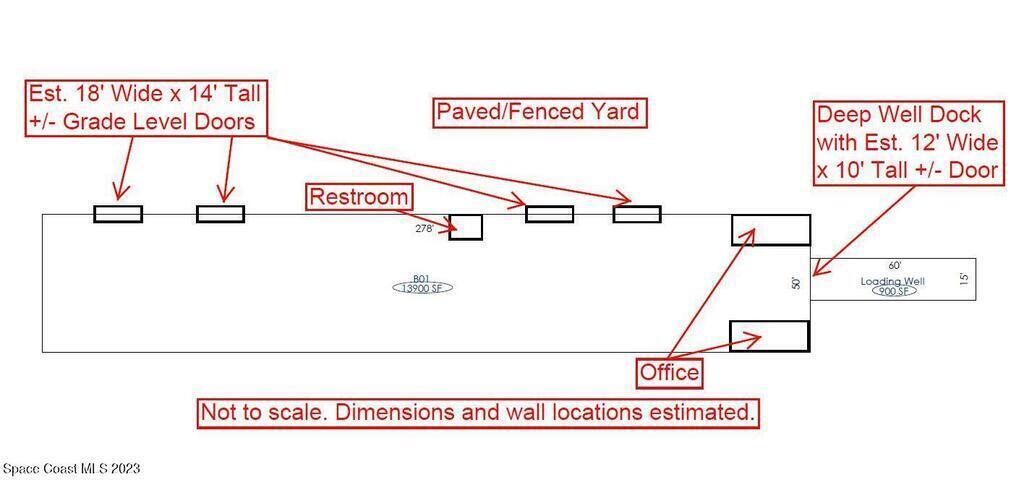 Excellent opportunity to lease a 13,900 SF stand-alone warehouse with a Paved/Fenced/Cleared YARD in the heart of Palm Bay! Building dimensions estimated 50' deep x 278' wide. Interior has a +/- 624 SF office and 1 restroom. Rest is concrete flooring with 14' - 16' +/- clear height throughout. Building is 100% fire sprinklered. There are four 18' wide x 14' tall +/- grade level doors + one deep well dock with a 12' wide x 10' tall +/- door. Zoning is City of Palm Bay Light Industrial which allows Warehousing, Light Manufacturing, Outdoor Storage & More! Property is located in the heart of Palm Bay with close proximity to US1, Palm Bay Road & Interstate 95. Surrounding neighbors include L3Harris, Raytheon, Leonardo DRS & UPS to name a few. Make this the future home for your business today!