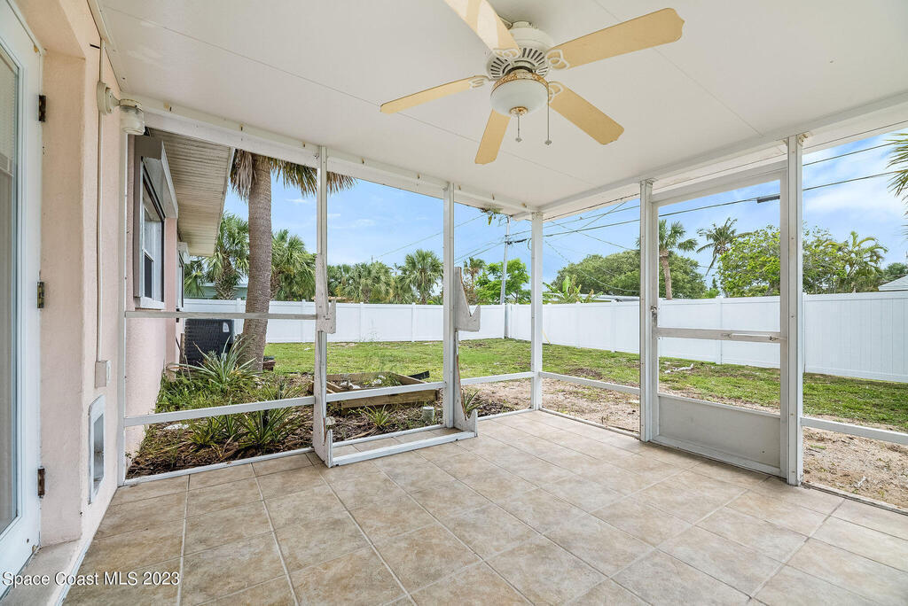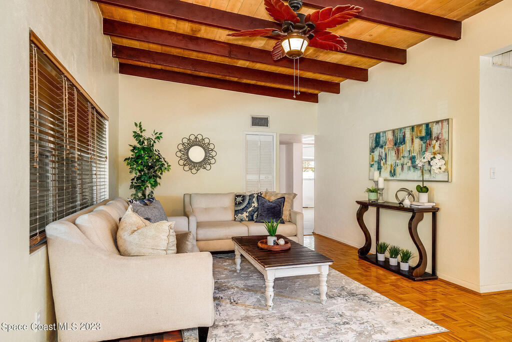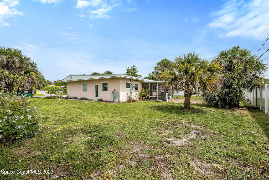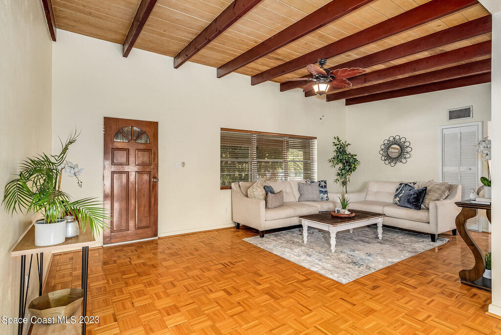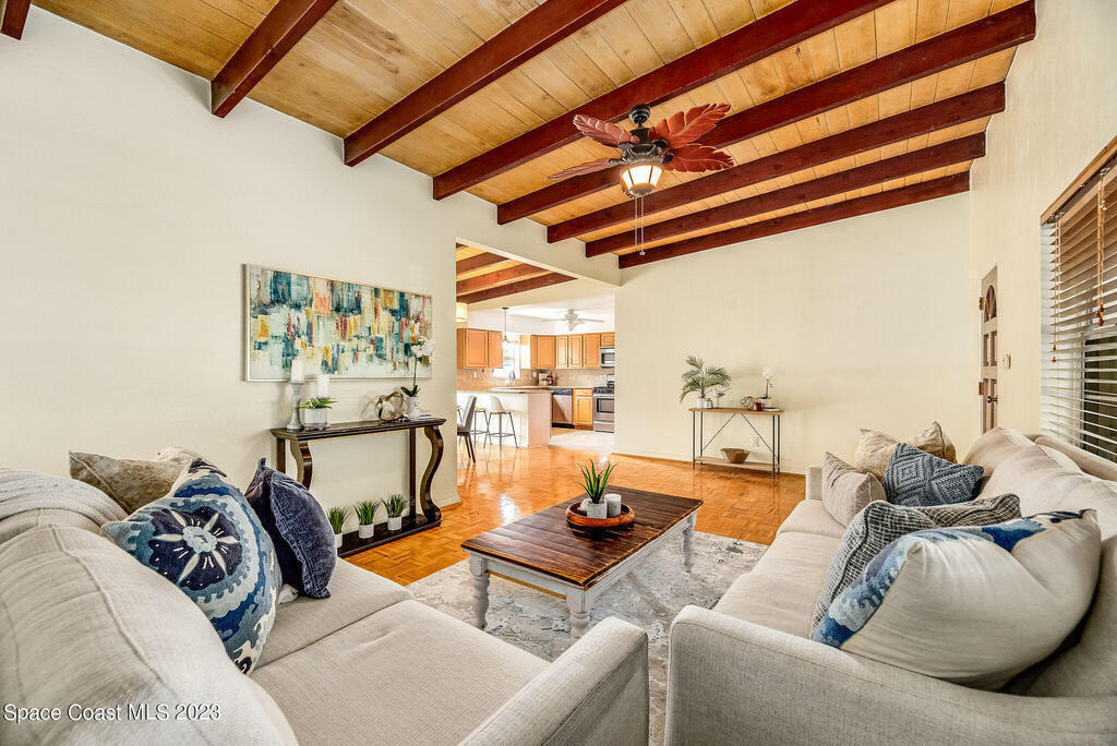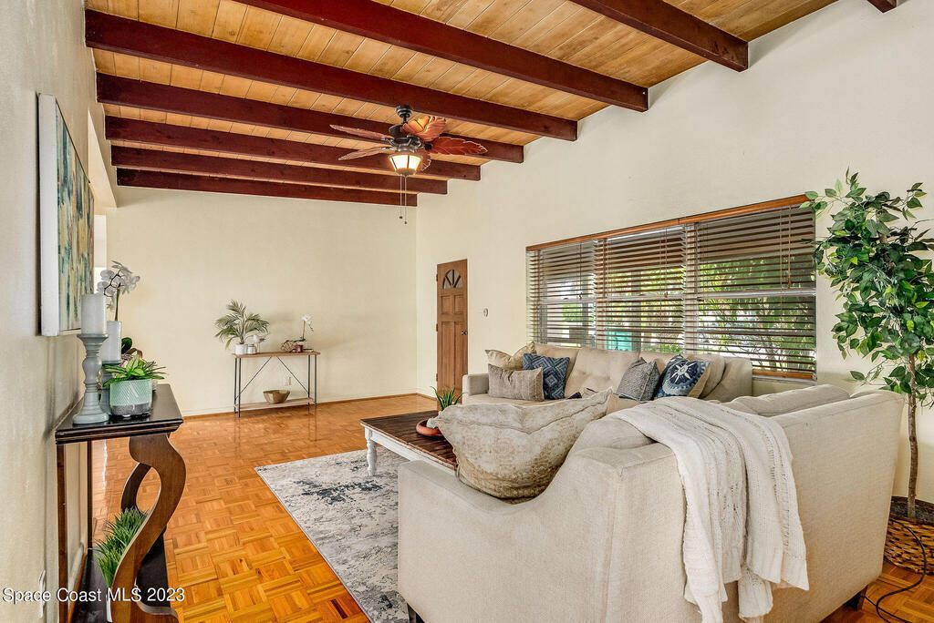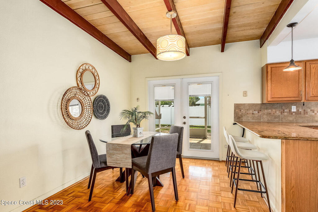 Beachside bungalow in the heart of Indialantic. Just steps to the Atlantic Ocean you will find this cozy home a great fit for your beachside oasis. Pristine Original Parkay flooring throughout main living areas. Living room is accented with vaulted custom exposed beams giving it tons of personality. The kitchen tastefully remodeled to offer solid wood cabinetry and granite. Also offers a large breakfast bar that overlooks a quaint dining area. The roof replaced in 2019 Screened porch overlooks your large backyard, almost fully fenced.
