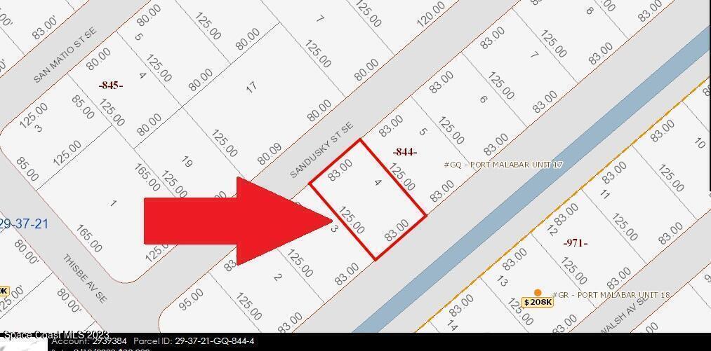 1 of 2 side-by-side buildable single family residential lots [Rs2 Zoning] with a drainage right-of-way easement canal in the back available in Port Malabar Unit #17 of Palm Bay. The lots that are adjacent to each other are 1150 and 1160 Sandusky. Nicely located in the SE Section of Palm Bay near Bayside Lakes, this property is just 2 miles -5 minutes- to Publix Shopping, 3.6 miles -8 minutes- to Bayside High and Westside Elementary Schools, 11.7 miles -24 minutes- to the Melbourne Square Mall, and just 13.9 miles -29 minutes- to the beaches in Indialantic. From Exit #173 of I-95 go west on Malabar Road. Turn left on San Filippo Drive SE and proceed south for 3.9 miles. Turn right on Sandusky Street SE. The lot will be on the left.