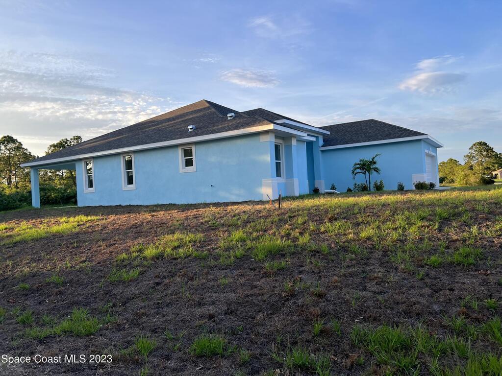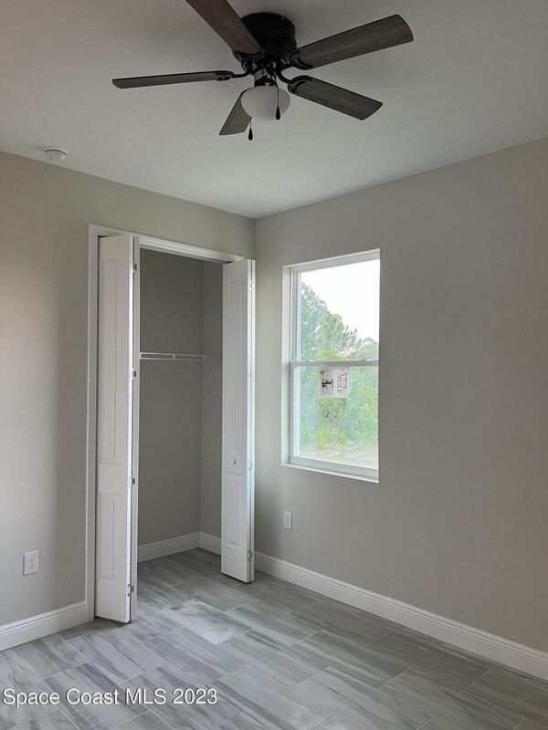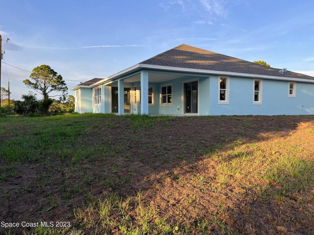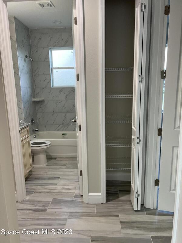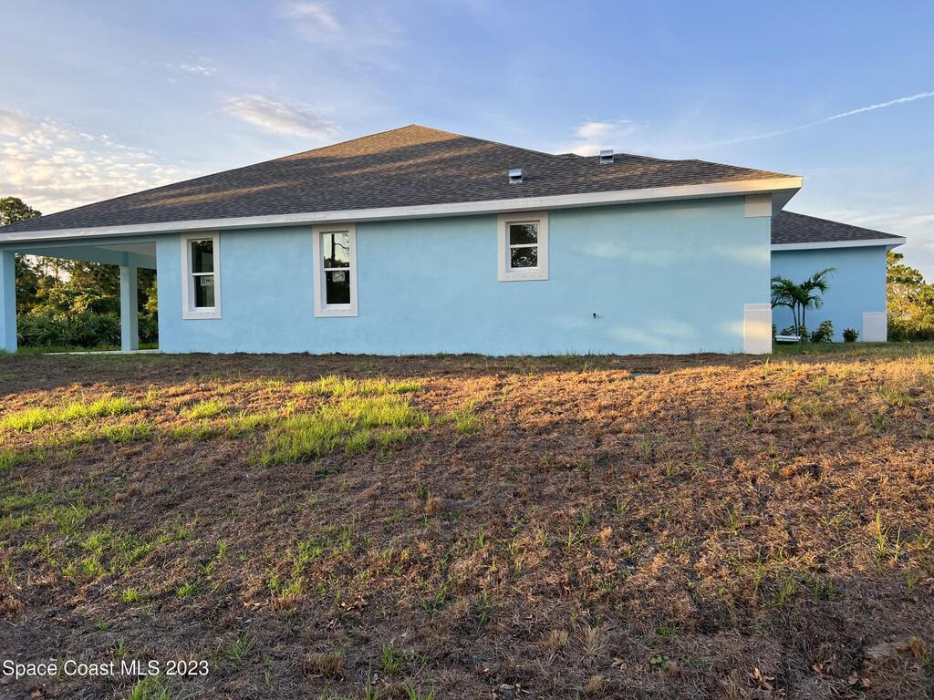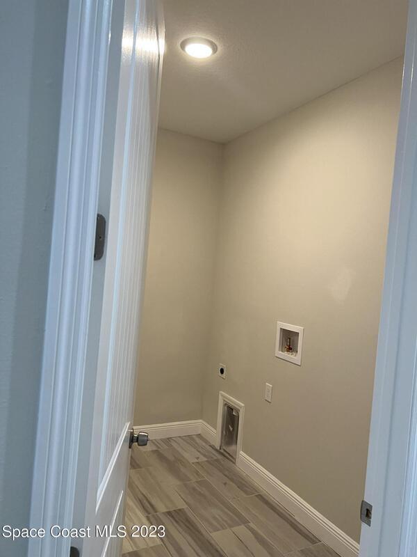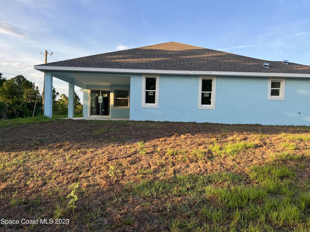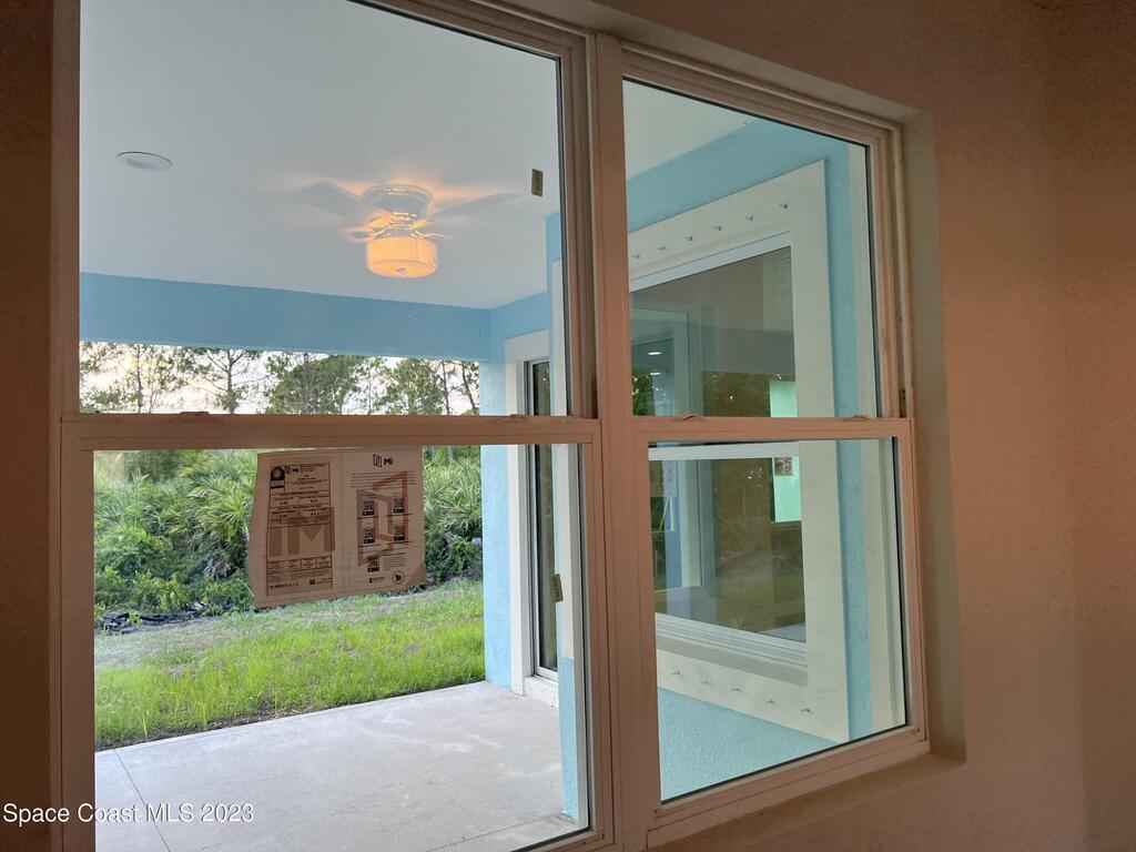 Come to see this new construction custom designed 4 bedrooms, 3 full bathrooms house. It's unique in Palm Bay. It offers separate dining room, living room, breakfast nook and a spacious family room with a sliding door opens to the large trussed covered back porch and windows and gutters all around. The spacious master suite features two windows and a sliding door facing the back porch, large walking closet for hers and closet for his, Jetted Bathtub, tiled shower with glass door, double sinks, and a large linen closet. This home offers 9.4 ft ceilings throughout and 12.8 ft ceilings front porch. It has a beautiful kitchen with stainless steel appliances. It offers a large laundry room with a large linen closet, linen closets near each room, and tiles throughout. You must see it!