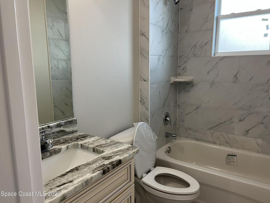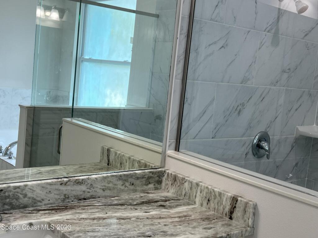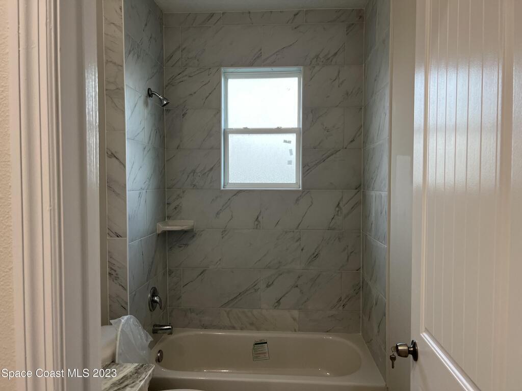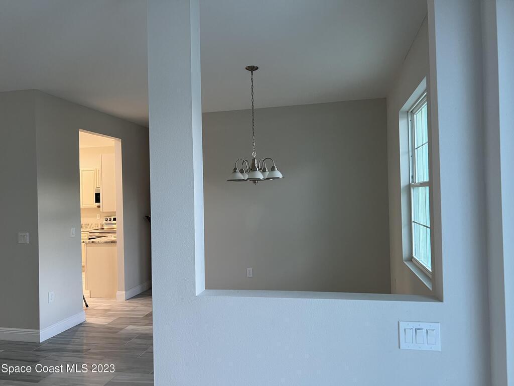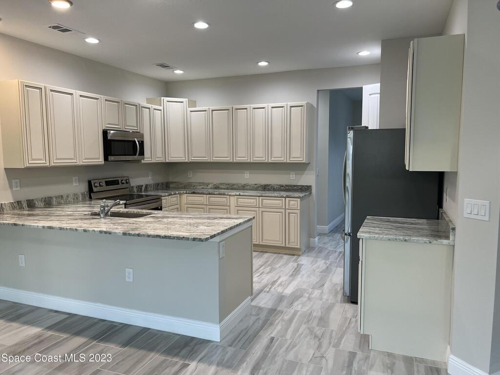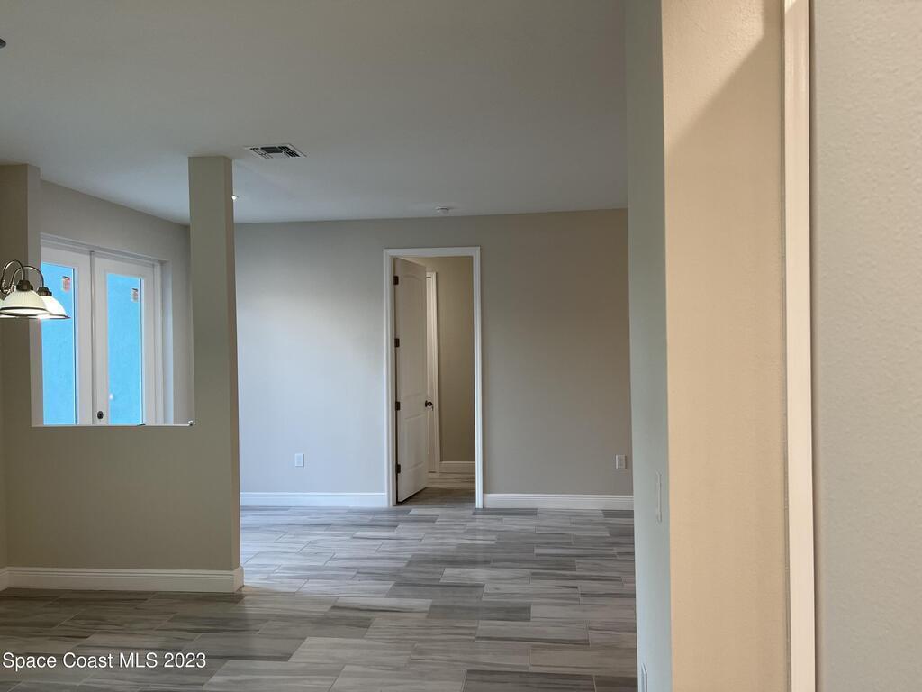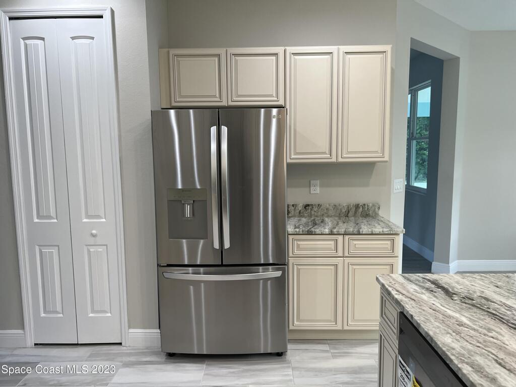 Come to see this new construction custom designed 4 bedrooms, 3 full bathrooms house. It's unique in Palm Bay. It offers separate dining room, living room, breakfast nook and a spacious family room with a sliding door opens to the large trussed covered back porch and windows and gutters all around. The spacious master suite features two windows and a sliding door facing the back porch, large walking closet for hers and closet for his, Jetted Bathtub, tiled shower with glass door, double sinks, and a large linen closet. This home offers 9.4 ft ceilings throughout and 12.8 ft ceilings front porch. It has a beautiful kitchen with stainless steel appliances. It offers a large laundry room with a large linen closet, linen closets near each room, and tiles throughout. You must see it!