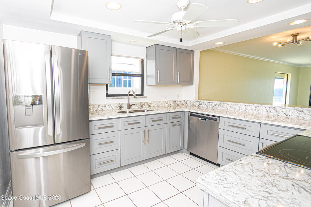 New Price!! Best priced DIRECT oceanfront, not a partial view. This 3 bedroom, 2 bath NE Corner Penthouse features amazing ocean views. Main Bedroom has on suite bath and large walk-in closet. Updated Kitchen features contemporary grey shaker cabinetry & beautiful quartz counter tops, newer appliances (2022), A/C (2018), Elevator (2022), Balconies (2018). One Garage Space & large private storage closet. 3rd Bedroom/Flex Room/Office has built-in custom cabinets. Complex features secured lobby, pool & oceanfront deck, large clubhouse for social functions. One Month Minimum Rental. Great location in the heart of Indialantic and close to 5th Avenue with many great restaurants, Publix, Starbucks all within walking distance.