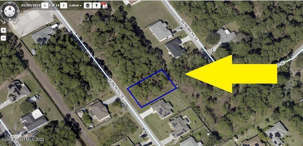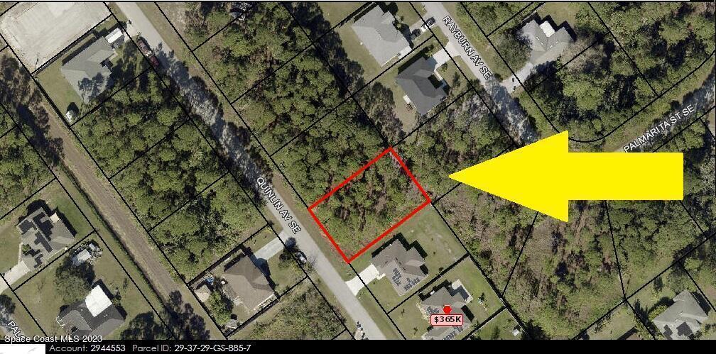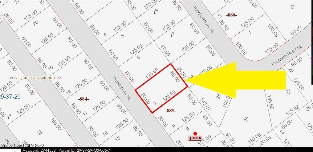 .23 acre build-able single family residential lot [Rs2 Zoning] available in Port Malabar Unit #22 of Palm Bay. Located in the southeast section, this lot is just 3.0 miles - 8 minutes to the Publix Supermarket, 3.3 miles - 8 minutes to Sunrise Elementary School, 12.8 miles - 27 minutes to Melbourne International Airport, and 14.7 miles - 30 minutes to the beaches of Indialantic. From exit #173 of I-95 go west on Malabar Road NE for .2 miles, left on San Filippo Drive SE for 4.7 miles, right on Eldron Boulevard SE for .3 miles, left on Quesada Street SE for .2 miles, and left on Quinlin Avenue. The lot will be on your left.