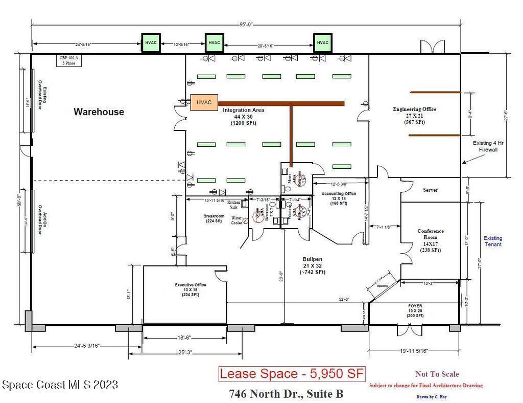 Excellent opportunity to lease a 5,950 SF flex / warehouse / integration unit in the heart of Melbourne! Unit is estimated 2,500 SF Office + 3,450 SF Integration/Warehouse. Interior includes a reception area, 3 offices, conference room and 3 restrooms. Rest is warehouse/integration with 12' - 16' ceiling height. Unit is 100% HVAC and has two 14' wide x 10' tall +/- grade level overhead doors. Zoning is City of Melbourne Light Industrial (M1). City Water/Sewer and 3-phase 400 amp FPL electric is available. Property is easily accessible via three Interstate 95 interchanges within a 3-mile radius. Close proximity to the Melbourne International Airport, L3Harris, and all of the other hi-tech & engineering companies in the area. Make this this the future home for your business today!