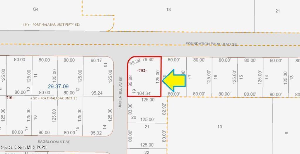 Oversized 0.30 acre buildable residential corner lot available in Port Malabar Unit 15 of Palm Bay. Conveniently located in the southeast section, this lot has city water available, and is just 2.1 miles - 6 minutes to the Walmart Supercenter, 2.6 miles - 6 minutes to Turner Elementary School, 9 miles - 21 minutes to Melbourne Airport, and 11 miles - 25 minutes to the beaches of Indialantic. From exit #173 of I-95 go west on Malabar Road for .2 miles, left on San Filippo Drive for 1.2 miles, left on Foundation Park Boulevard for .2 miles and right on Underhill Avenue. The lot will be on your left at the corner.