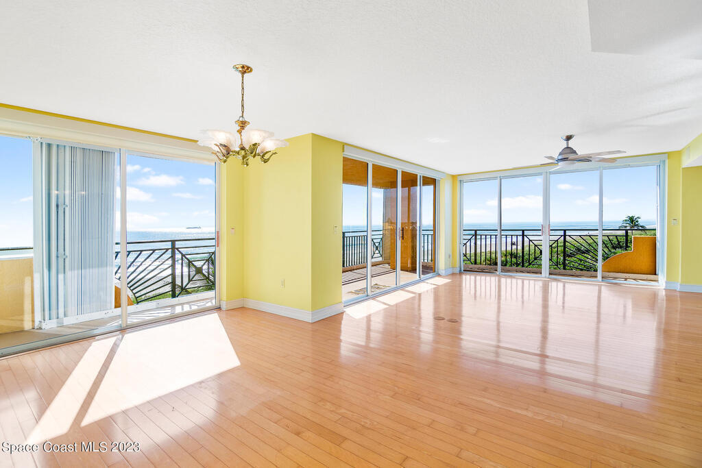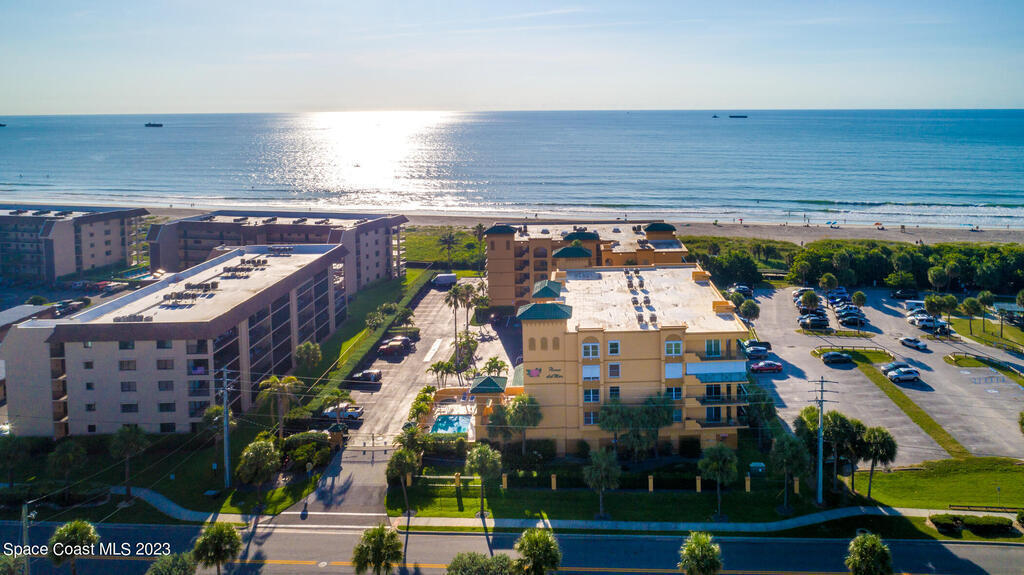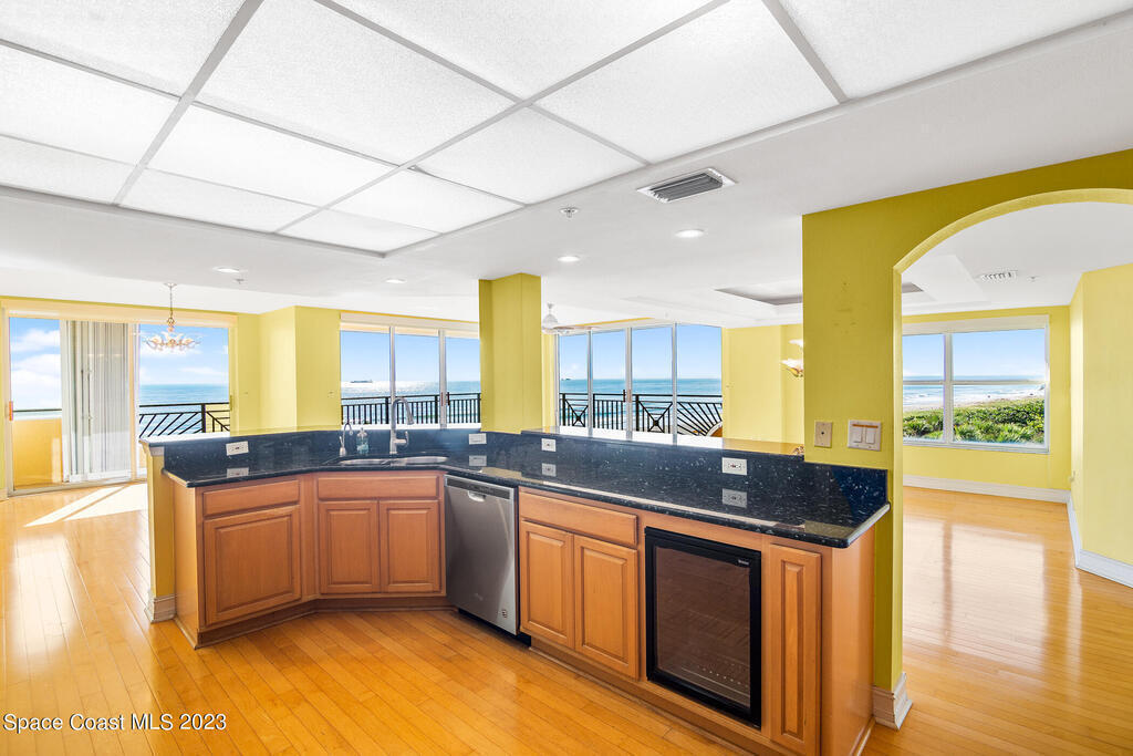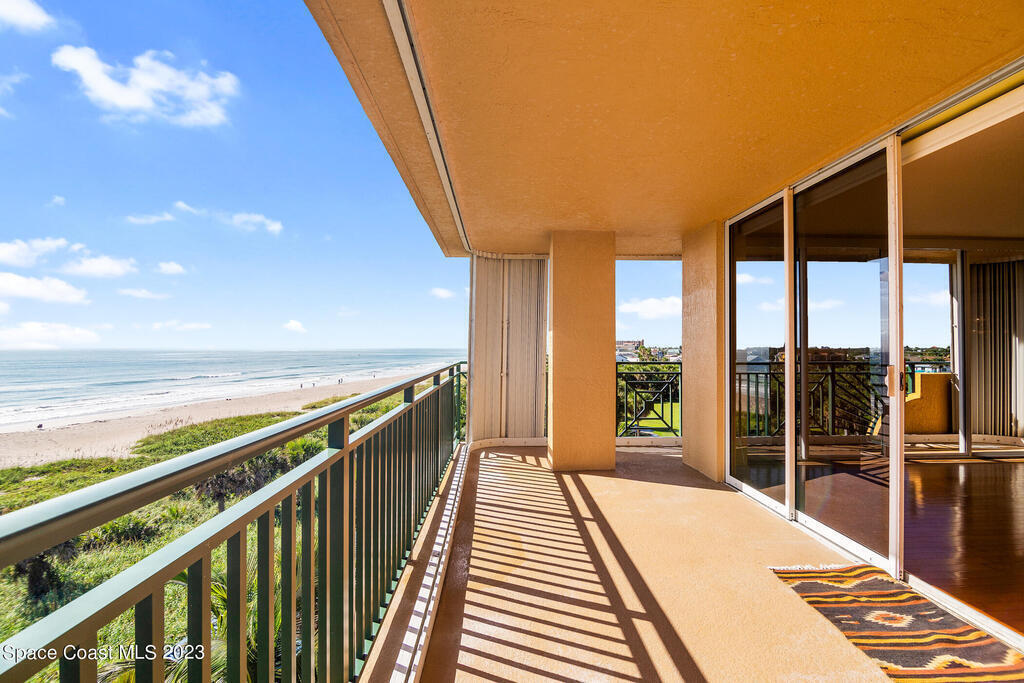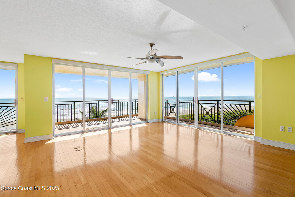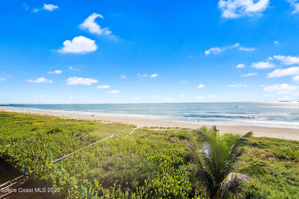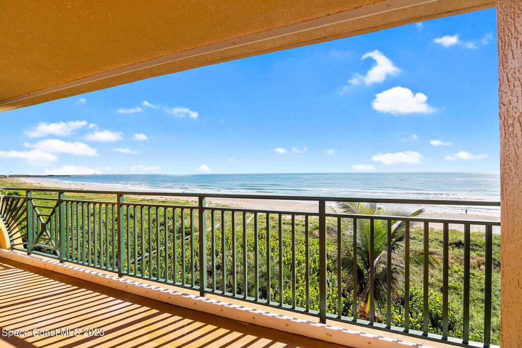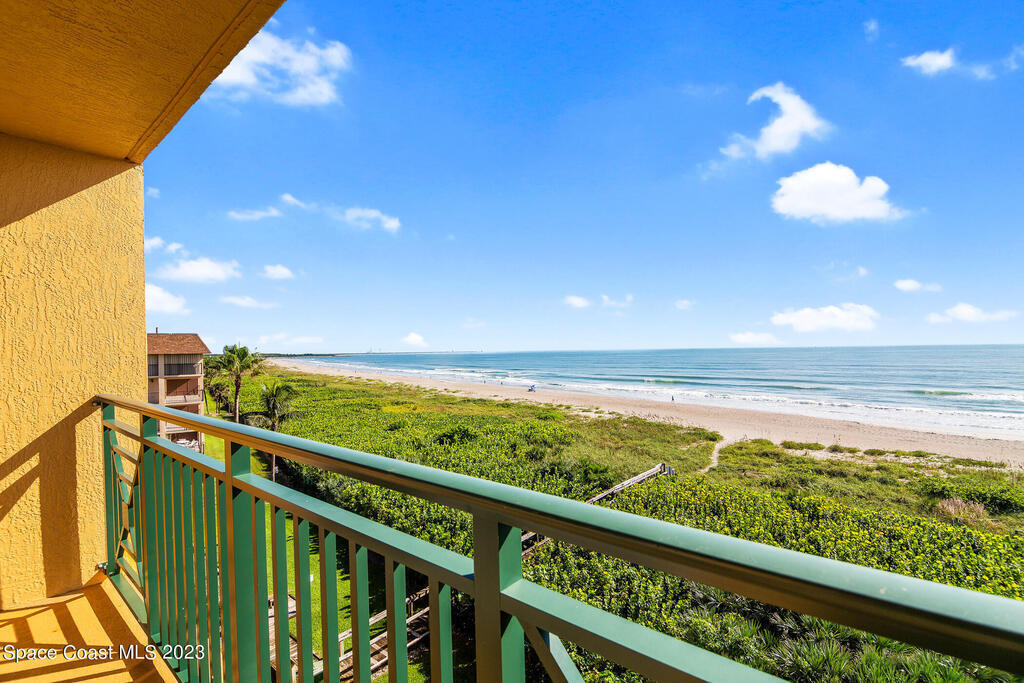 Captivating view! It's the only way to describe this epic corner and top floor unit in desirable Flores Del Mar. An expansive split floor plan with 4 bedrooms, bonus room/study (or additional bedroom), 3 bathrooms, and hardwood floors. The luxurious primary suite with it's private balcony and spa-like bathroom has a bidet, large walk-in closets, spa tub, large custom shower, dual vanities and a huge overhead skylight. The corner balcony offers panoramic ocean views (south facing) however the balcony has northern views towards the Space Center as well. The granite kitchen offers plenty of space for the chef while enjoying ocean views. Unit includes a 2 car garage, pool, sauna & exercise room. Units don't come along often in this highly desirable complex. Condo fee only $688/month!