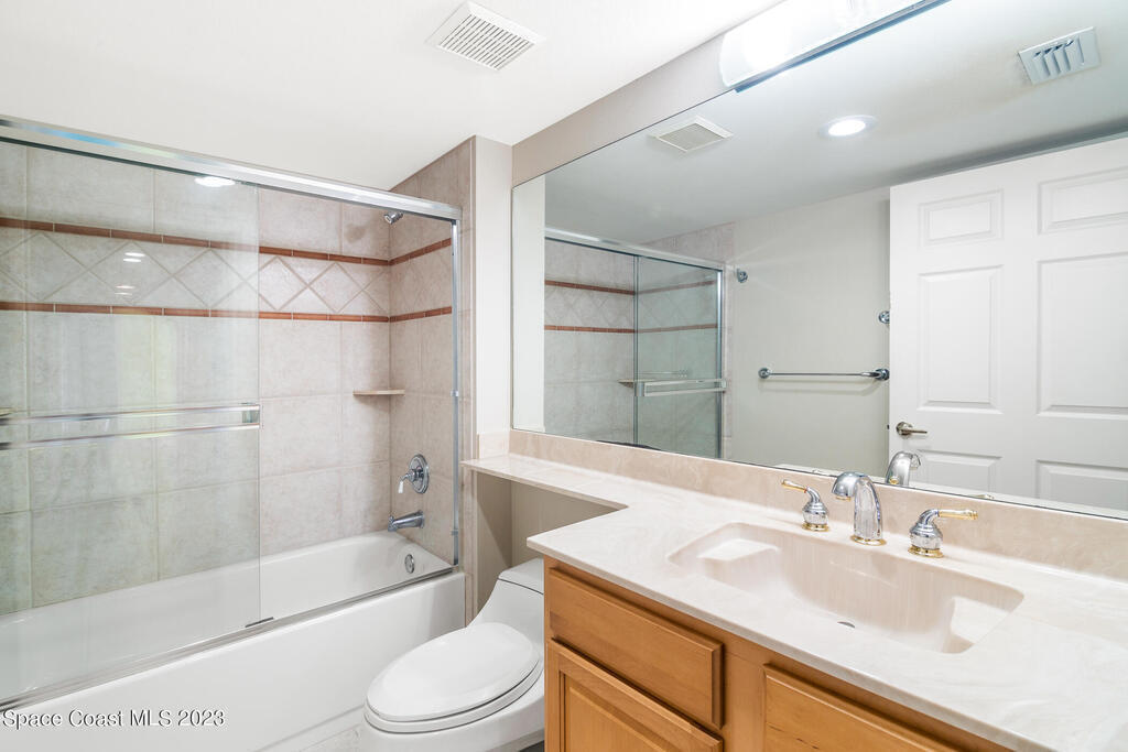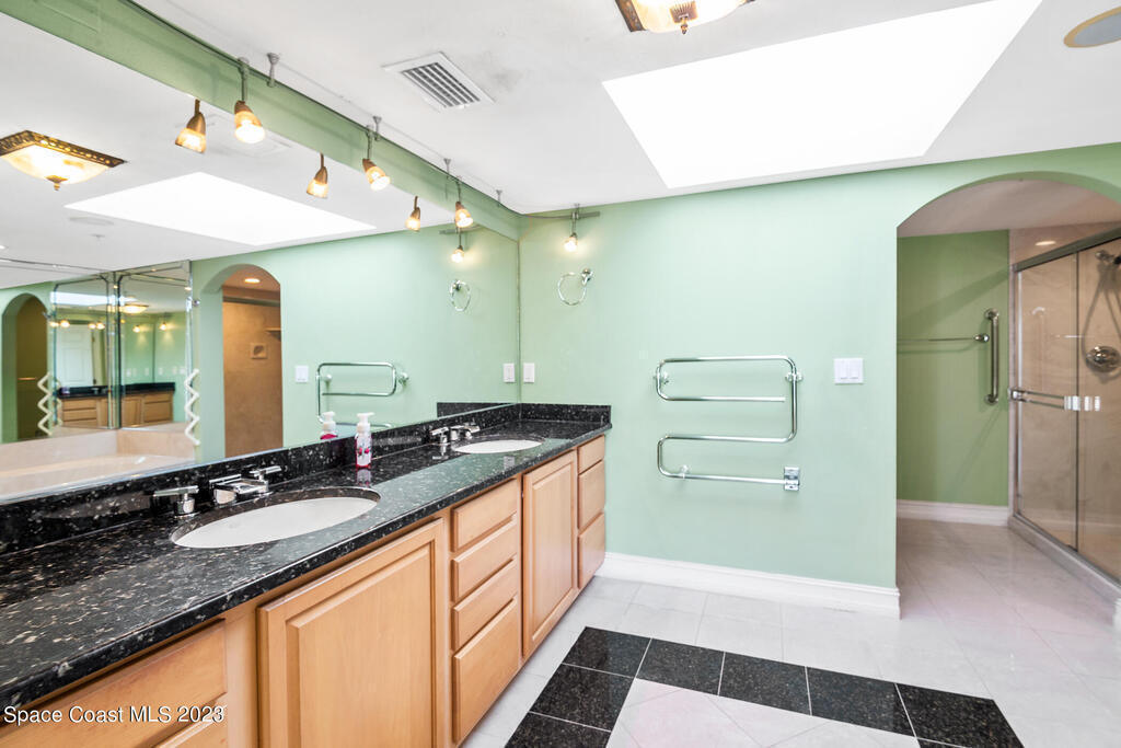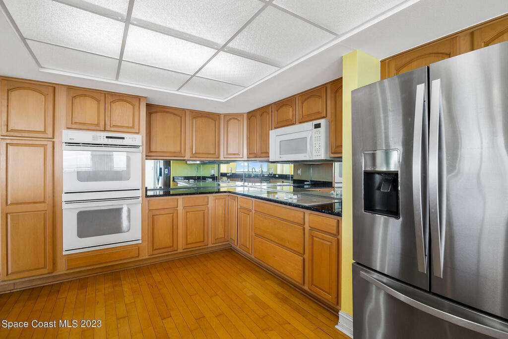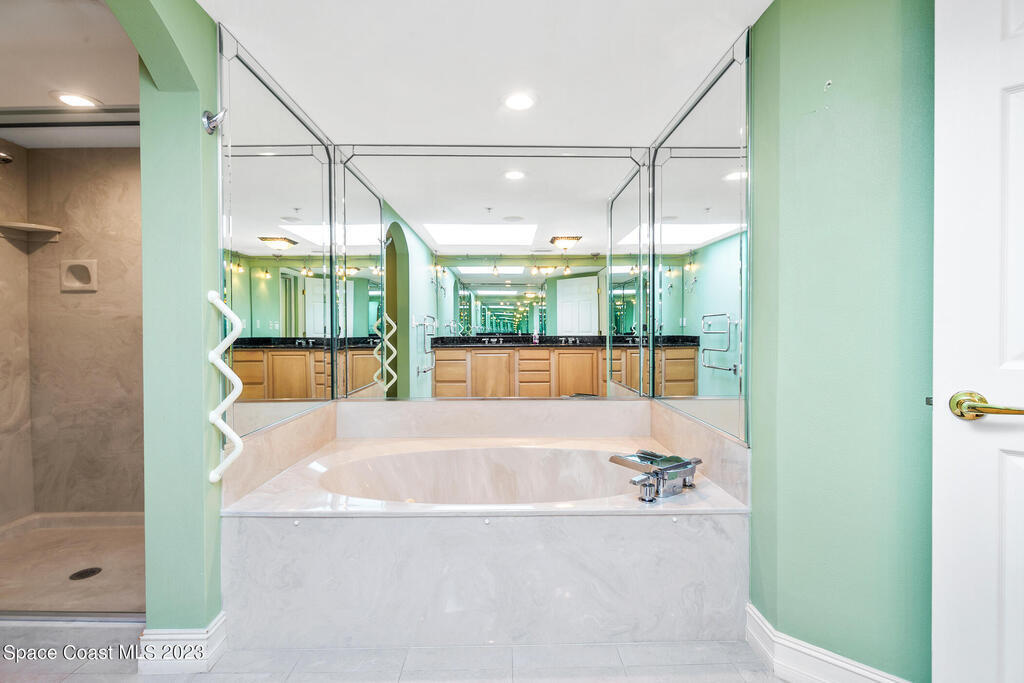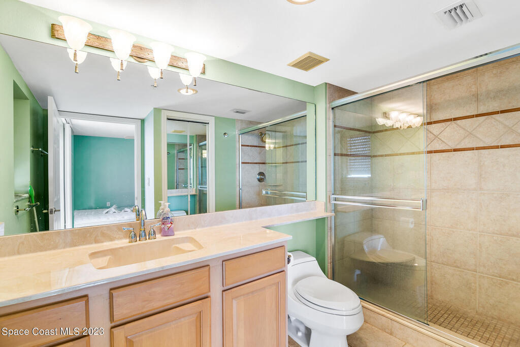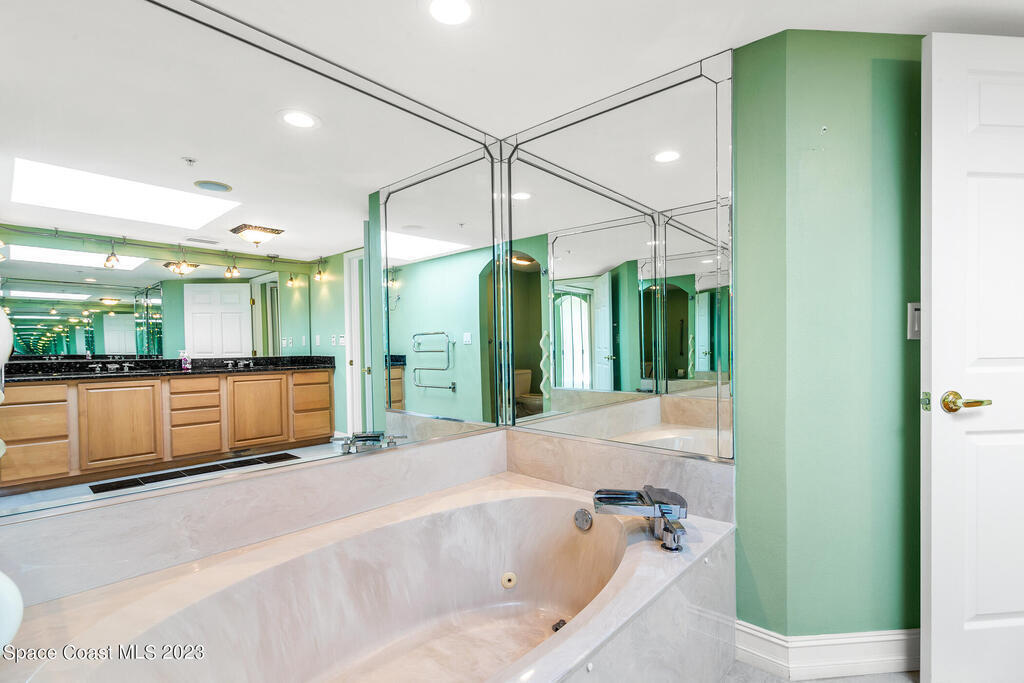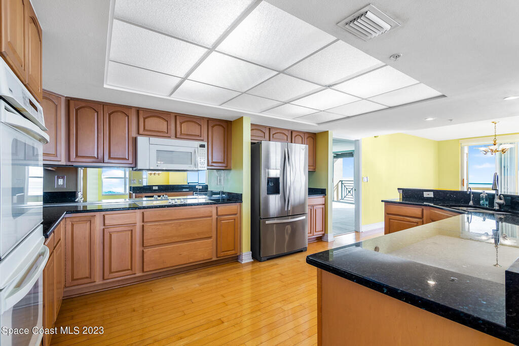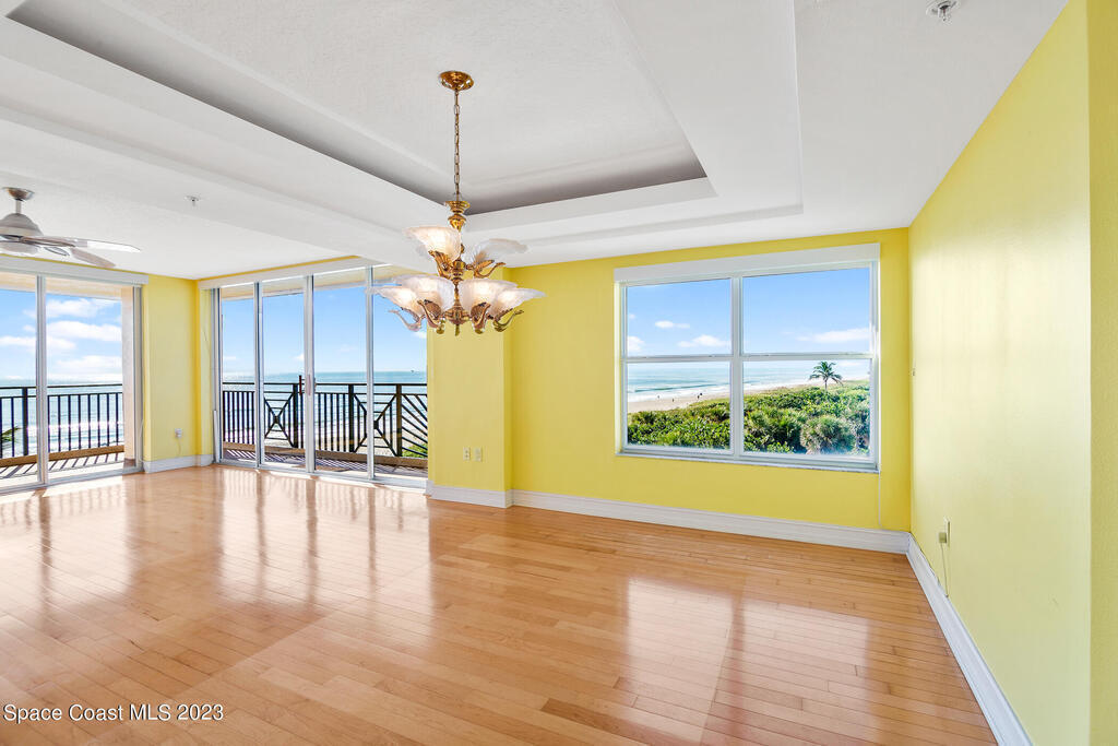 Captivating view! It's the only way to describe this epic corner and top floor unit in desirable Flores Del Mar. An expansive split floor plan with 4 bedrooms, bonus room/study (or additional bedroom), 3 bathrooms, and hardwood floors. The luxurious primary suite with it's private balcony and spa-like bathroom has a bidet, large walk-in closets, spa tub, large custom shower, dual vanities and a huge overhead skylight. The corner balcony offers panoramic ocean views (south facing) however the balcony has northern views towards the Space Center as well. The granite kitchen offers plenty of space for the chef while enjoying ocean views. Unit includes a 2 car garage, pool, sauna & exercise room. Units don't come along often in this highly desirable complex. Condo fee only $688/month!