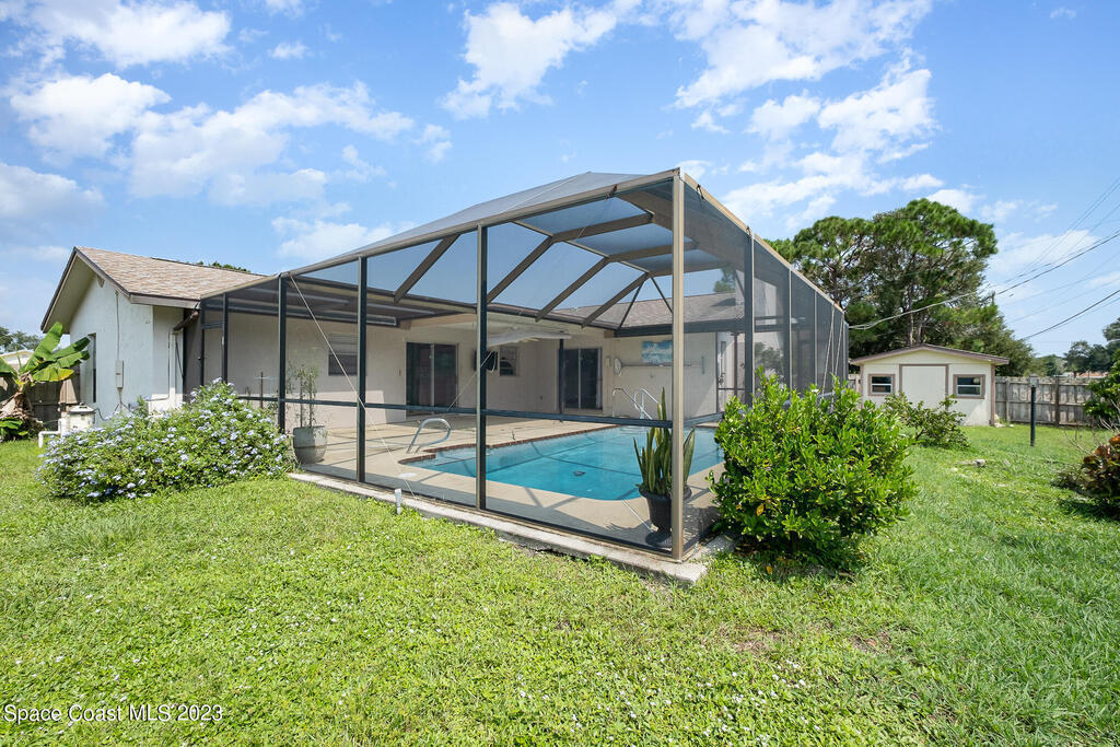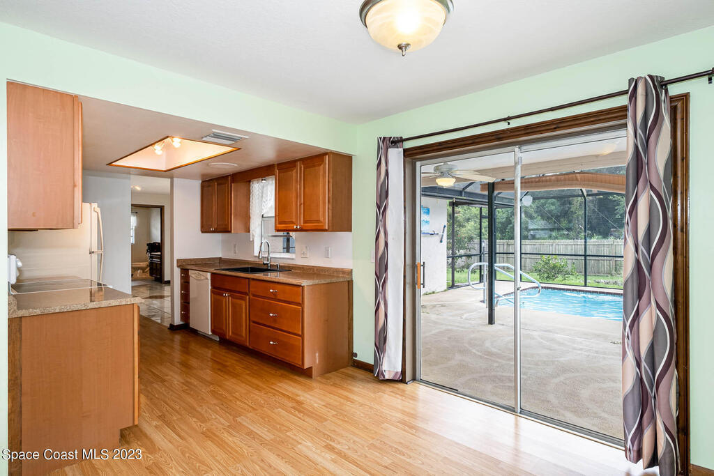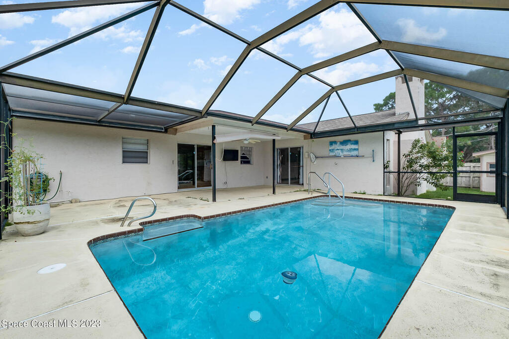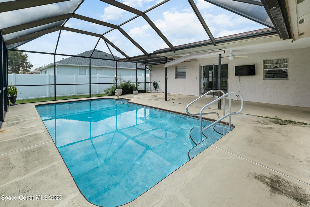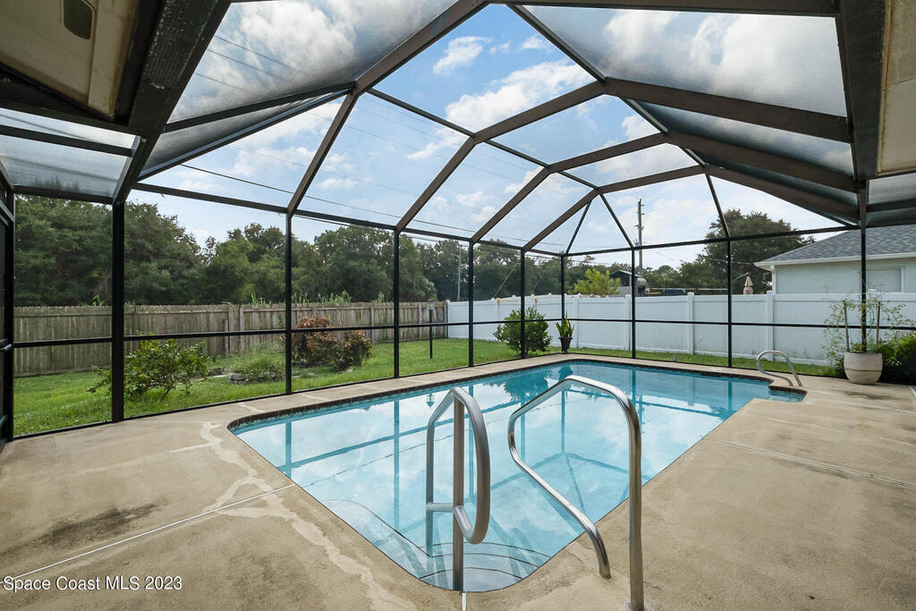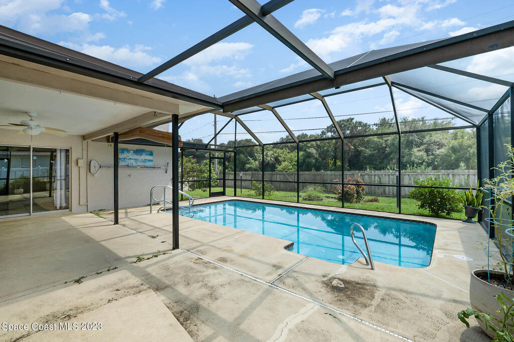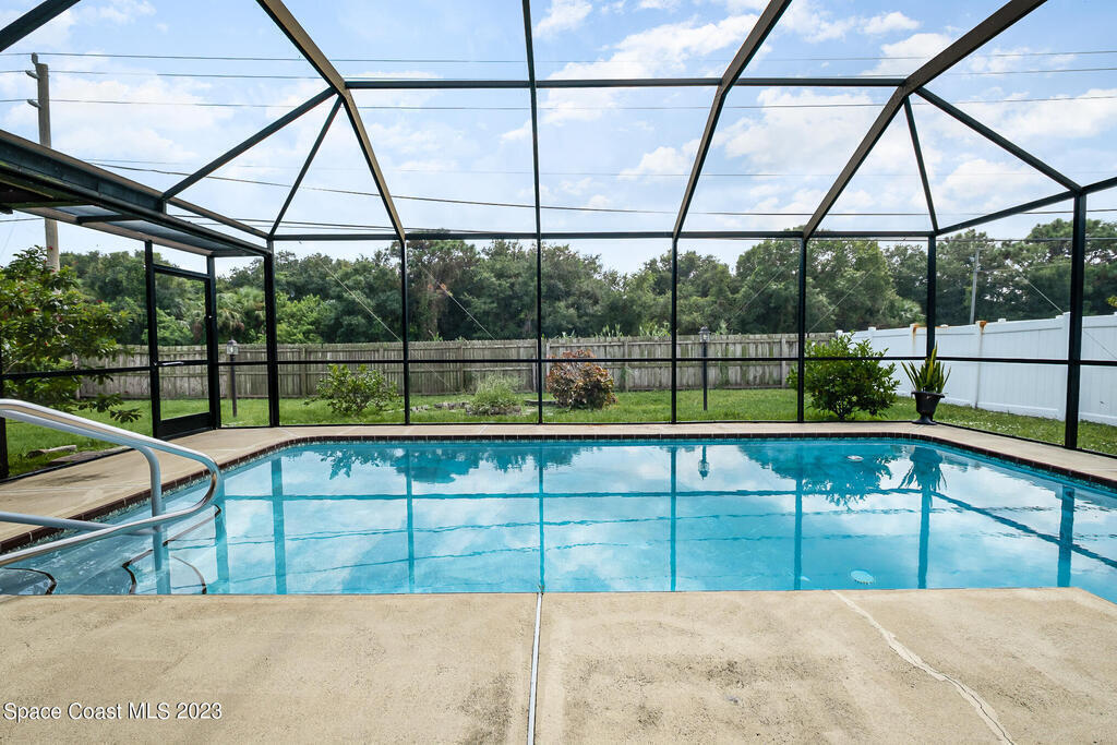 VA assumable mortgage @2.25% Pool Home in NE Palm Bay. 2 bedrooms, 2 full baths, 2 car garage, and a privacy fenced back yard. Kitchen has maple cabinets, counter tops, and huge sink. Wood laminate in living and dining area, ceramic tile in the family room, both baths, laundry room, and new carpeting in both bedrooms. Also has a screened front entry. Great neighborhood, convenient to interstate access and shopping.
