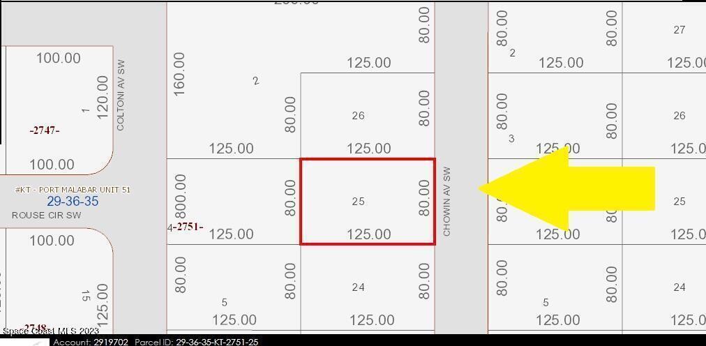 0.23 acre residential lot available in Port Malabar Unit #51 of Palm Bay. The property is located in the SW Section and near the famous Compound area. There is road access to the property; but the City of Palm Bay has not placed utilities in this area; so the lot and area are not buildable. This will make a nice investment property for the future of Palm Bay. From Exit #173 of I-95 go west on Malabar Road. Turn left on San Filippo Drive SE and proceed south for 7.3 miles. Continue on DeGroodt Road SW and turn left on St. Andre Boulevard. Proceed south for 1.6 mles and turn left on Drude Park Avenue SW, left on Ponder Street SW and right on Chowin Avenue. The lot will be on the right.
