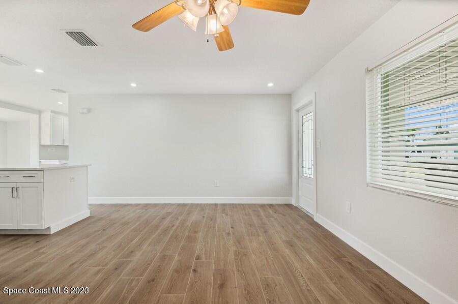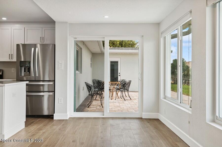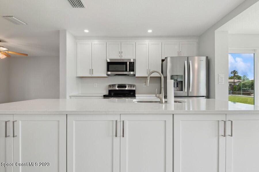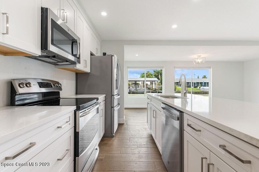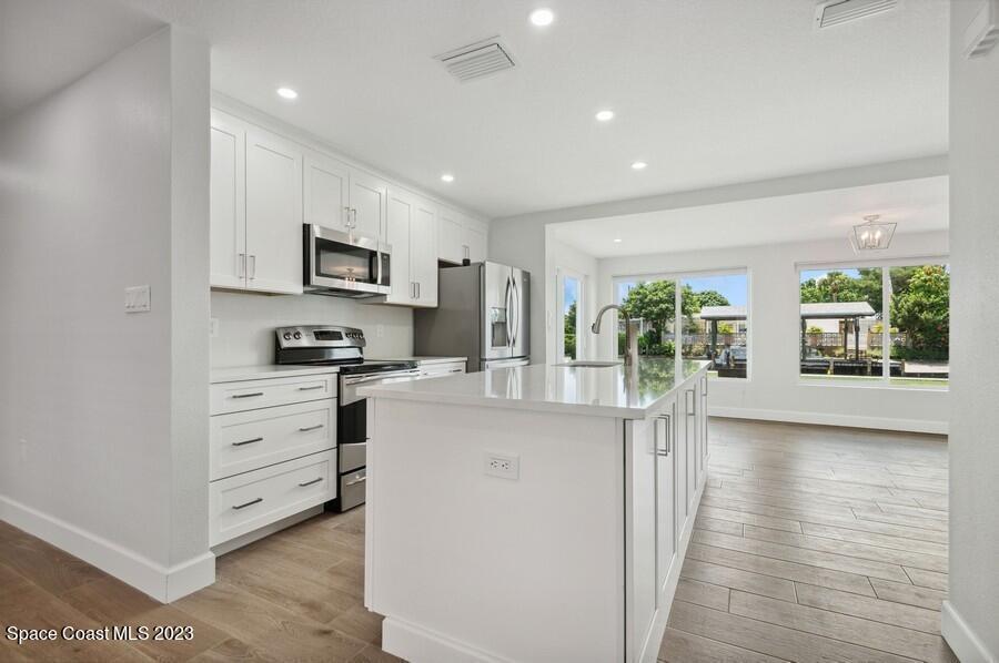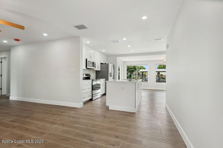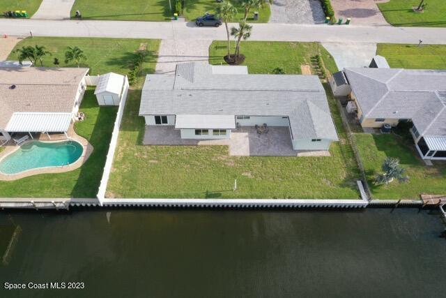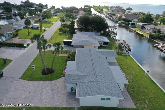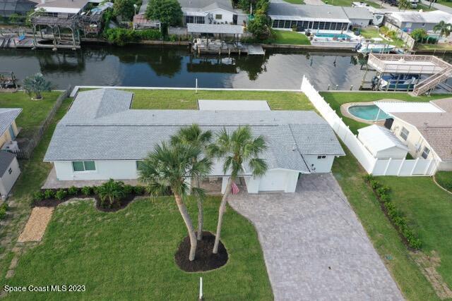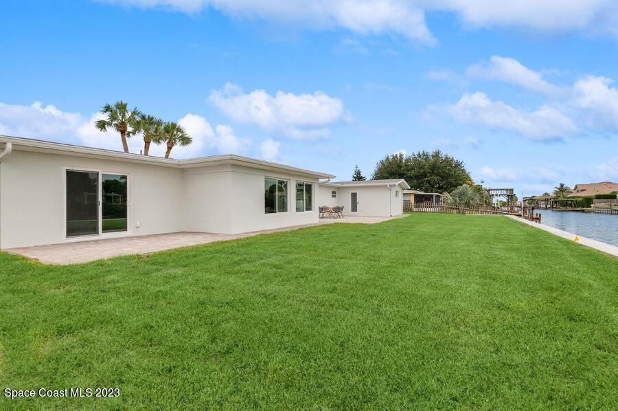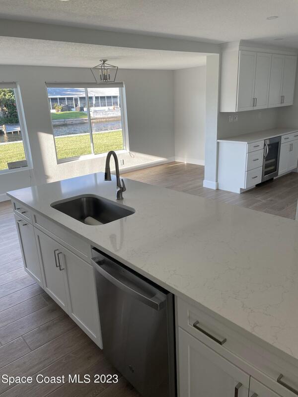 Move in ready! Deep water wide canal is perfect for a fisherman's dream location! Only 30 minutes from Orlando. Short boat ride to the Banana River & Port Canaveral. Completely remodeled concrete block home features a split & open floor plan w/ New impact low-E sliders & windows, upgraded plumbing(no cast iron piping),upgraded electrical(copper wiring),wood-look tile flooring,new cabinets in kitchen, dry bar with wine cooler & hall bath all have quartz countertops. New master bath w/ large walk in closet. New AC duct work w/WIFI thermostat, foam insulation in attic, freshly painted inside & outside. Appliances including washer, dryer & new tankless H20 heater. NEW SEAWALL w/Concrete cap, paver driveway ,walkways & patio.New sprinkler system &landscaping. New exterior stucco...MORE...