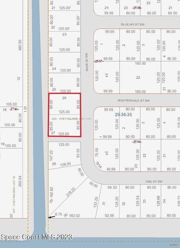 THIS LOVELY DOUBLE LOT BACKS TO A CANAL WITH ANOTHER SMALL CANAL ON THE SOUTH SIDE PROVIDING LOTS OF PRIVACY! FROM THE AERIAL PHOTO, IT APPEARS THERE IS A POWER WIRE RUNNING IN FRONT OF THE LOT. THIS NEEDS TO BE VERIFIED. THE AREA HAS A COUNTRY FEEL BUT IS JUST 7 MINUTES FROM THE BEAUTIFUL BAYSIDE LAKES DISTRICT, FEATURING A PUBLIX, DUNKIN', WALGREENS, TASTY EATERIES, MEDICAL SERVICES, AND MORE! BAYSIDE HIGH AND WESTSIDE ELEMENTARY SCHOOLS ARE A SHORT 5-MINUTE COMMUTE. THE NEW SOUTH I-95 INTERCHANGE IS 10 MINUTES AWAY, AND THE BUSY MALABAR ROAD CORRIDOR IS LESS THAN 15 MINUTES, OFFERING A LONG LIST OF STORES, RESTAURANTS, AND EVERYDAY CONVENIENCES. THIS SITE UTILIZES WELL WATER AND SEPTIC.