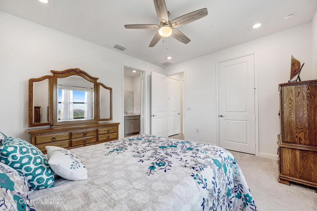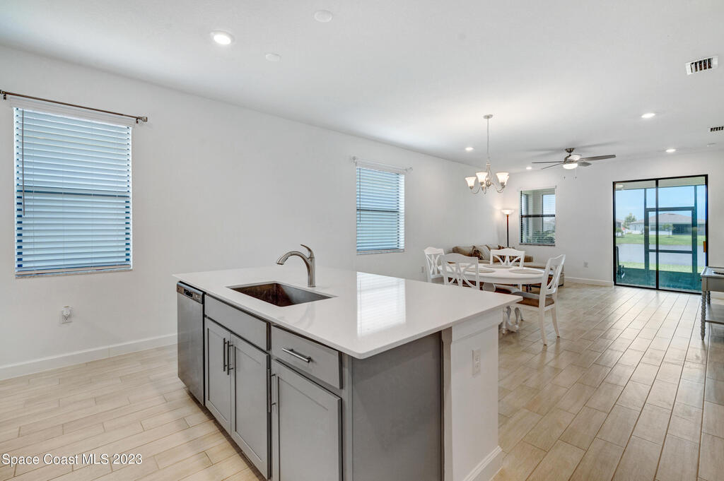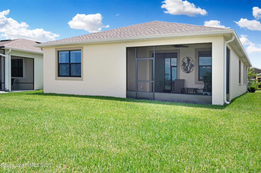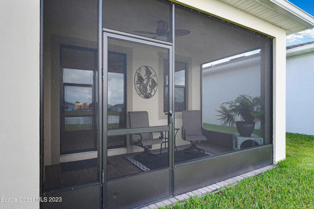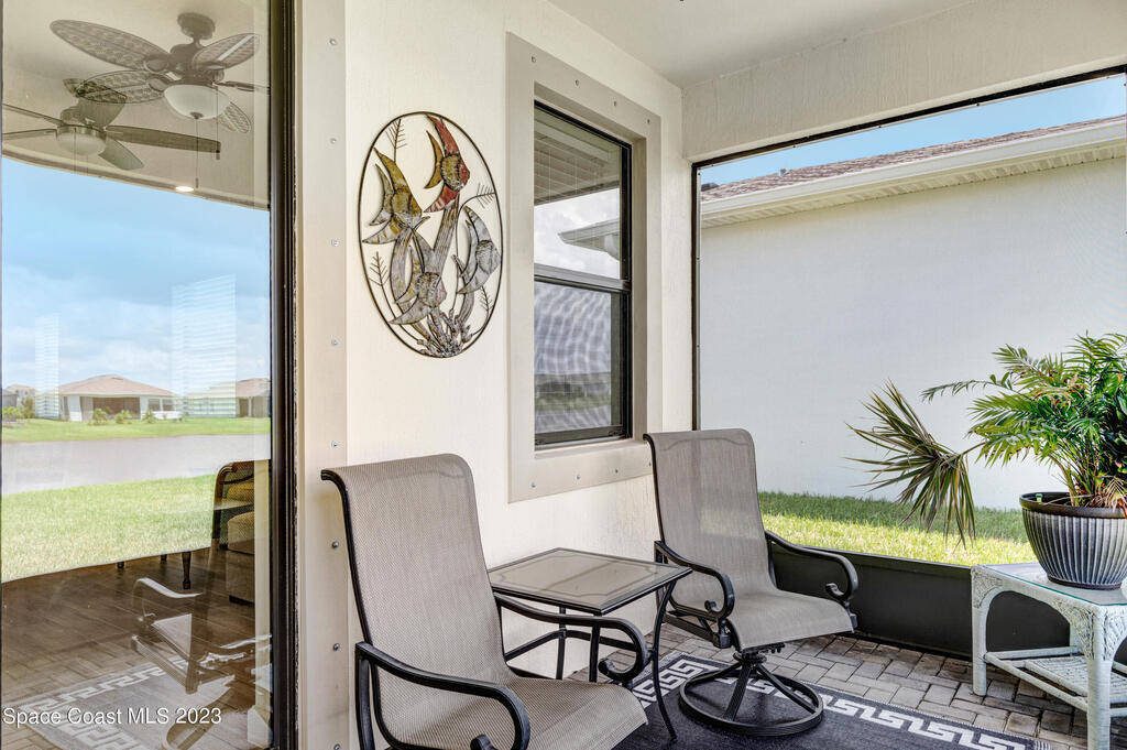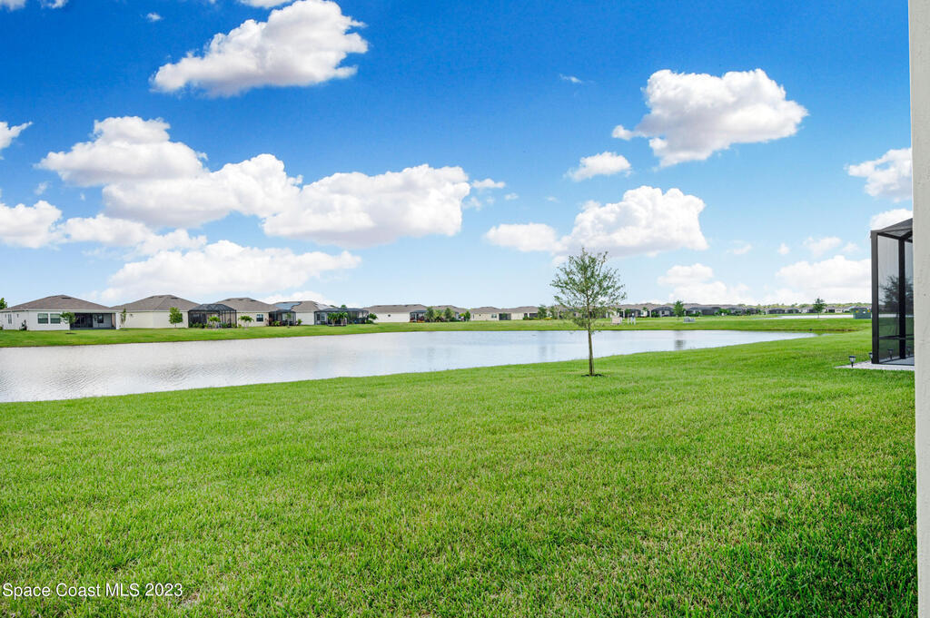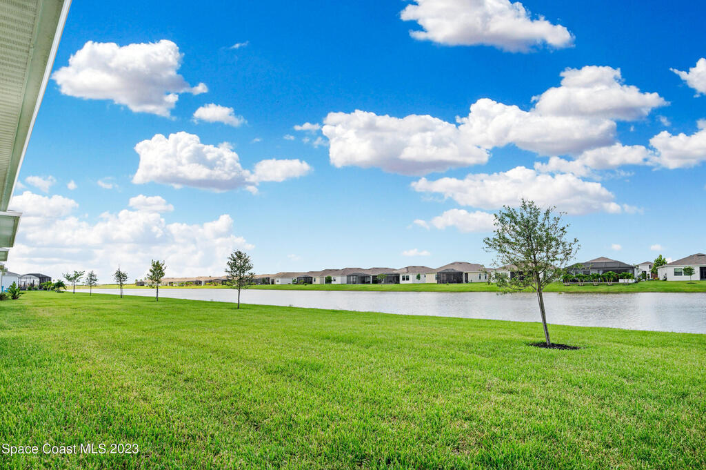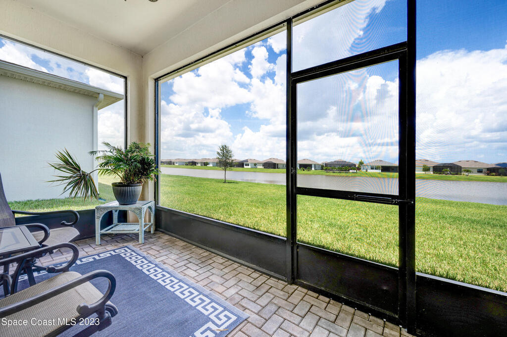 Priced to sell! In Bridgewater at Viera, a desirable active 55 plus community. This home has great curb appeal a favorite with a front porch and stone front. Inside the home you have nestled a 3 bedroom and two bath, room for company. The kitchen overlooks the great room, with an oversize island great for entertaining and baking. Kitchen is nicely detailed, all stainless steel appliances, 42'' grey cabinets, under cabinet lighting, backsplash and quartz countertops throughout. In the main living area you have upgraded wood like plank tile. Out on the screened Lanai you have a perfect water view, to relax take in the view. Start your morning at the coffee lounge at our very active amenity center. There's plenty to do, veranda and bar overlooking heated pool with jacuzzi, exercise room, billiards, art room, movie theater, a beautiful clubhouse with stage. Enjoy outdoor sports popular pickleball, tennis and bocce...Lawn care included. Golf cart friendly.Move in Ready!