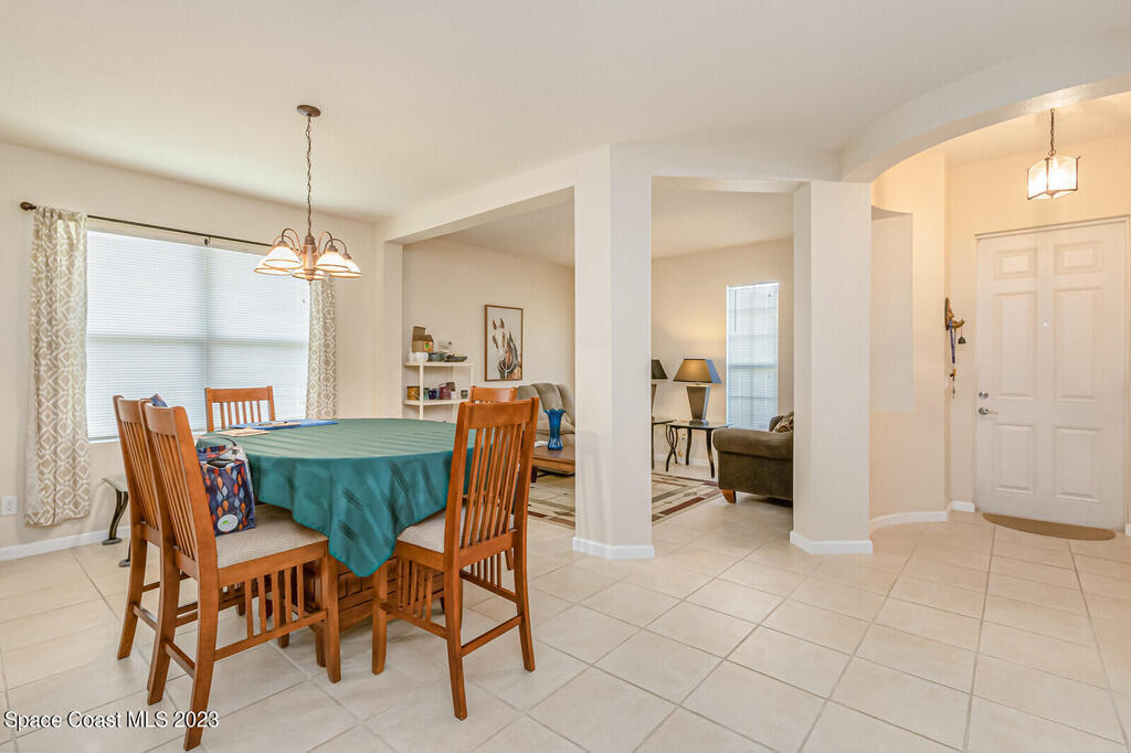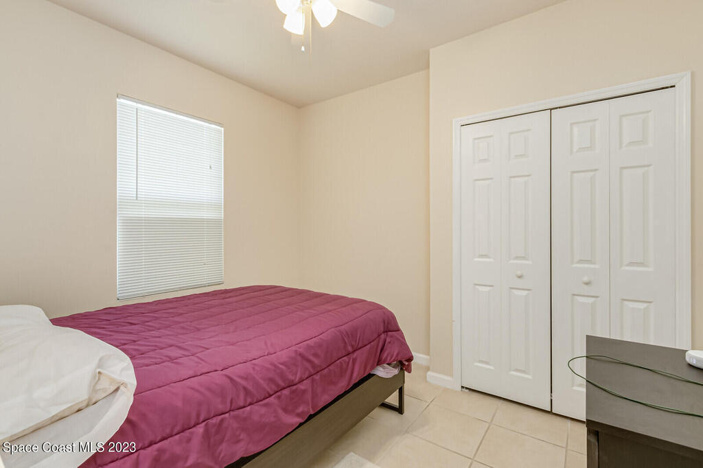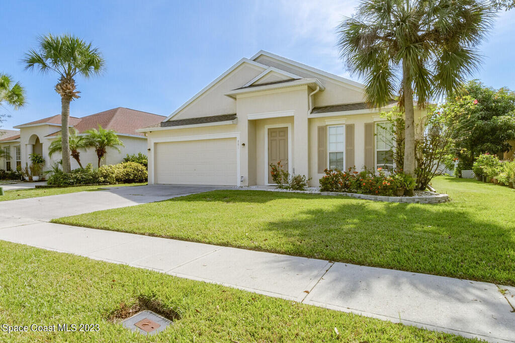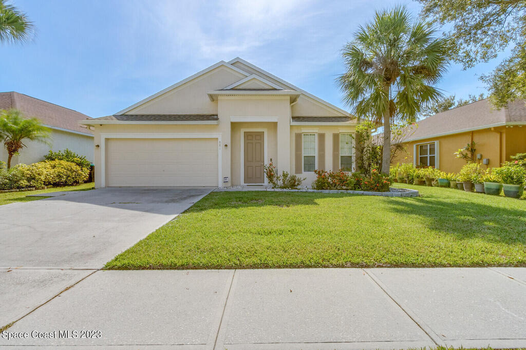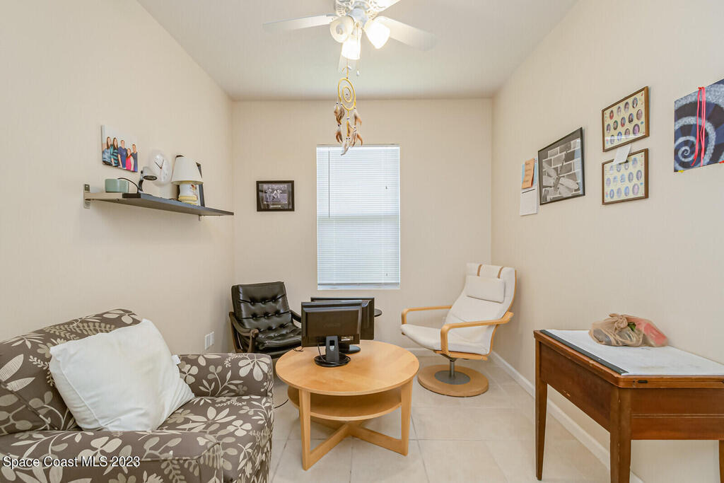 Back on the market. Buyer's financing failed. Inspections and appraisal done! Contemporary, move-in condition home boasts desirable floor plan with 3 bedrooms plus a flex room that's perfect for office, playroom, or gym. Roof is less than 2 years old; AC new in 2020. Tile throughout -- no carpet! Spacious kitchen with all appl included. Built-in desk area off kitchen. Master features a tub and separate shower along with a walk-in-closet. Porch has windows so it can be used screened or windowed for enjoyable year-round use. Back yard is partially fenced. Washer, dryer, freezer in garage, natural gas, alarm system also incl. Community boasts sidewalks and low HOA fees. Open area with scenic pond across street. Convenient to Florida Tech, I-95, beaches, schools, Patrick Space Force Base, shopping, and dining. Seller is downsizing. His loss is your gain. Come see it!