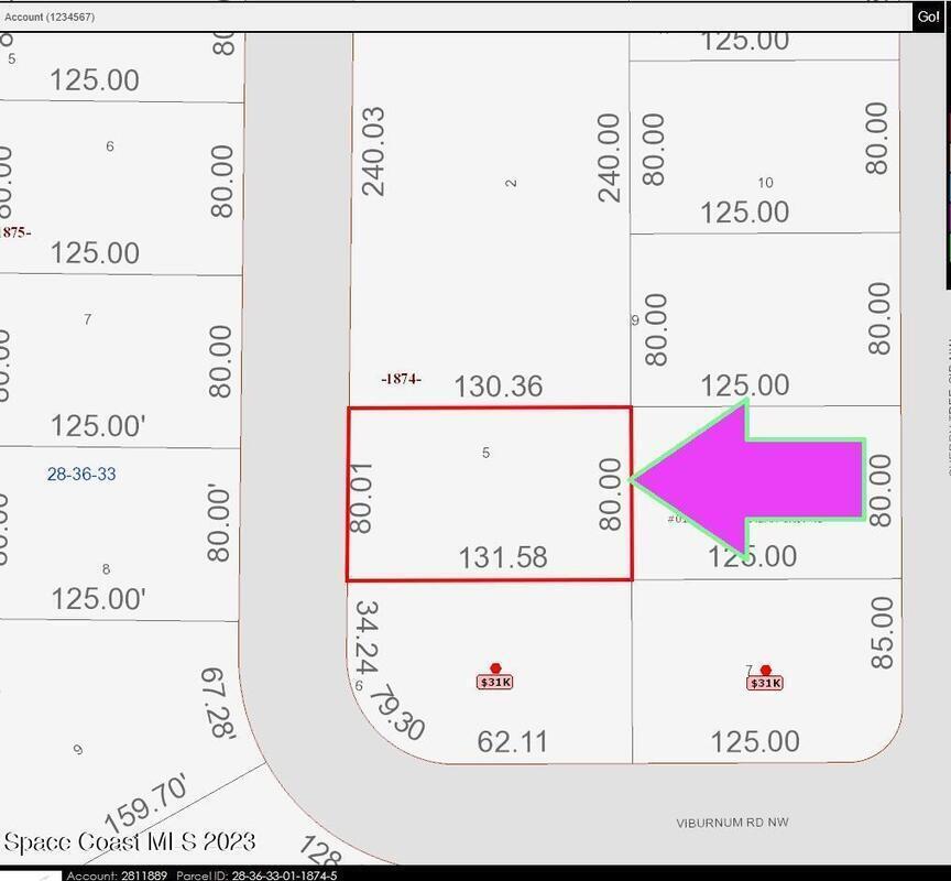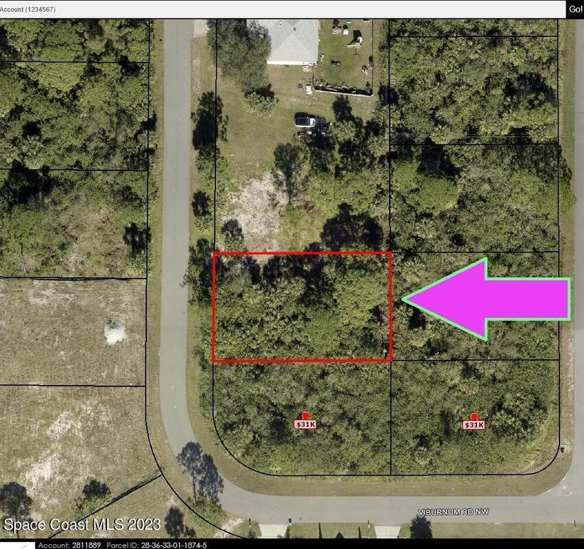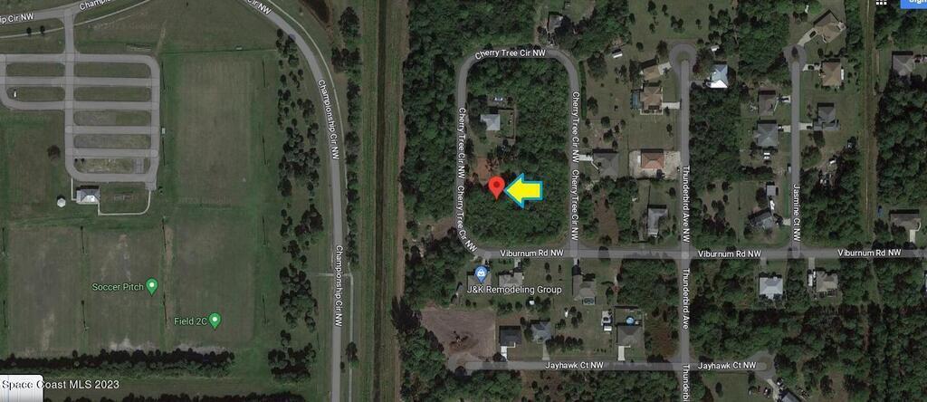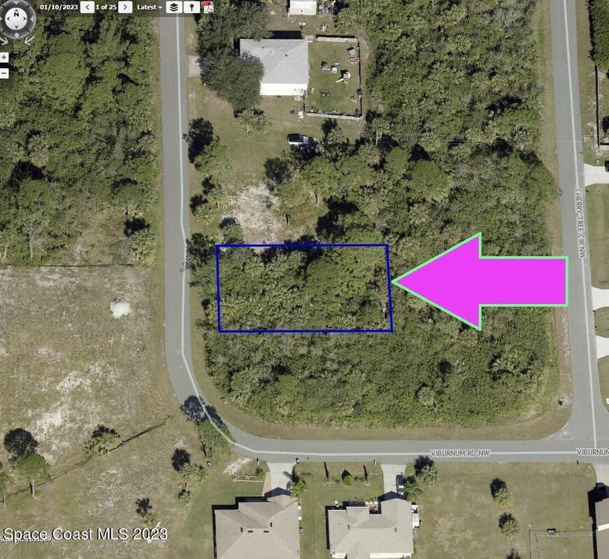 0.24 acre buildable residential lot available in Port Malabar Unit 41 of Palm Bay. Located in the northwest section, this lot is just 1.8 miles - 5 minutes to Heritage High School, 3,7 miles - 10 minutes to the Winn Dixie Supermarket, 14.1 miles - 24 minutes to Melbourne Airport, and 16.7 miles - 33 minutes to the beaches of Indialantic. From exit #180 of I-95 go west on US-192 for .5 miles, left on St Johns Heritage Parkway for 6.1 miles, left on Malabar Road for .7 miles, left on Thunderbird Avenue for .4 miles, left on Viburnum Road for .1 mile, road turns right and becomes Cherry Tree Circle. The lot will be on your right.