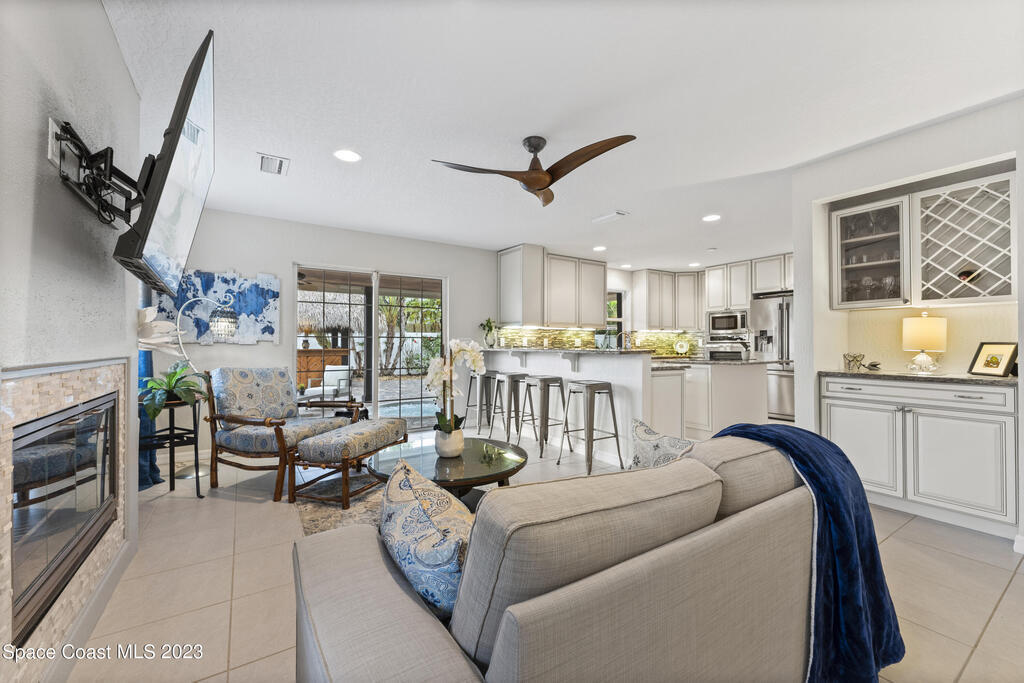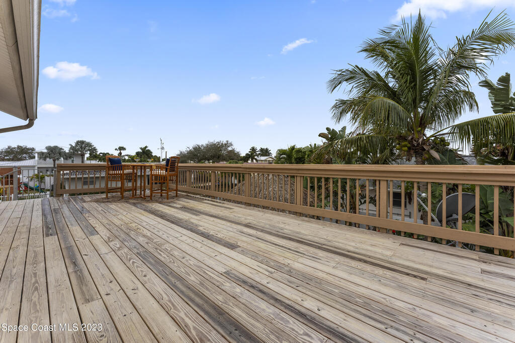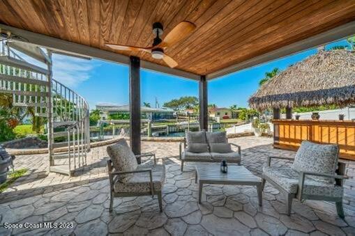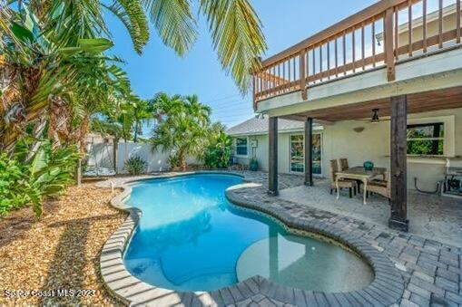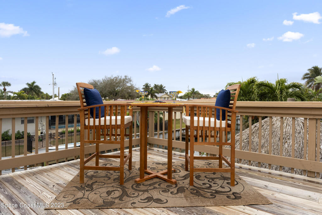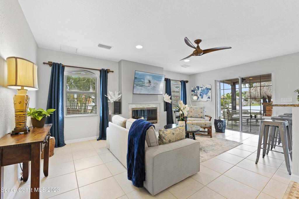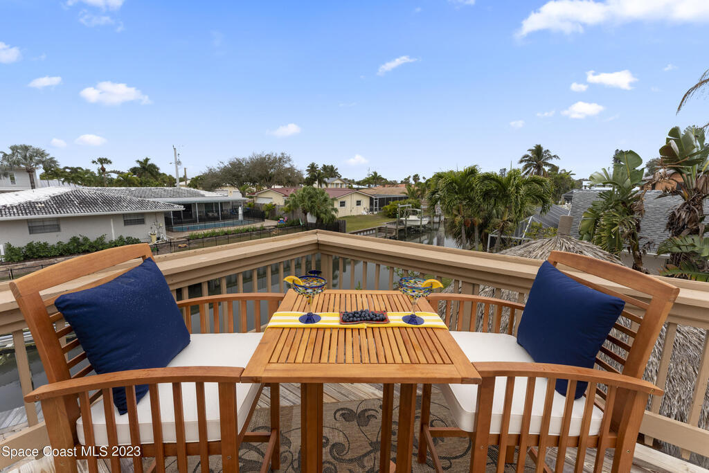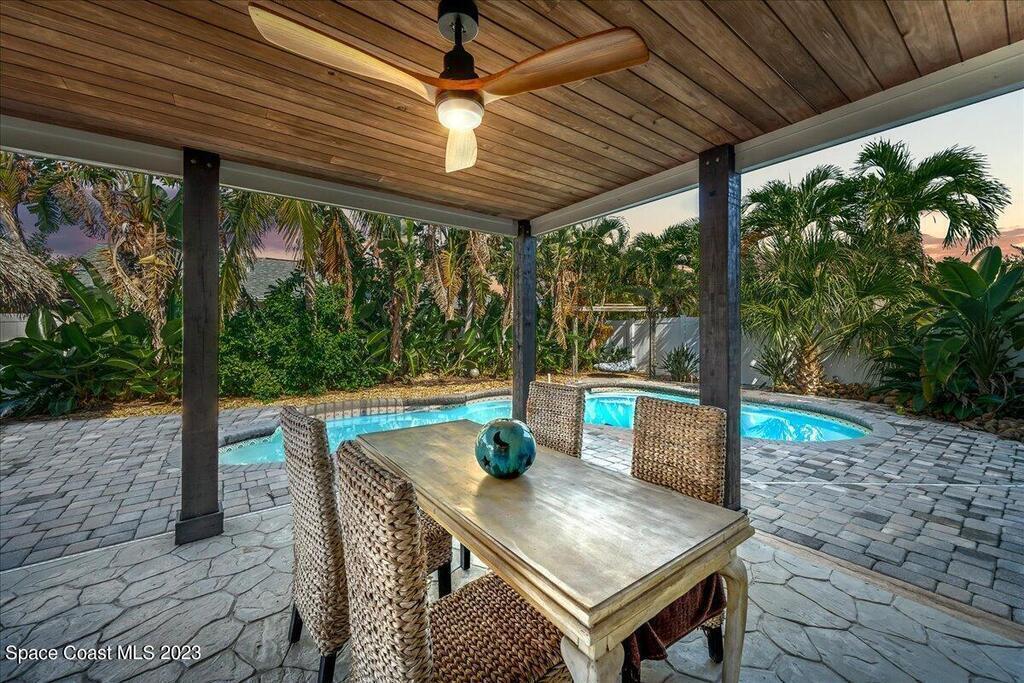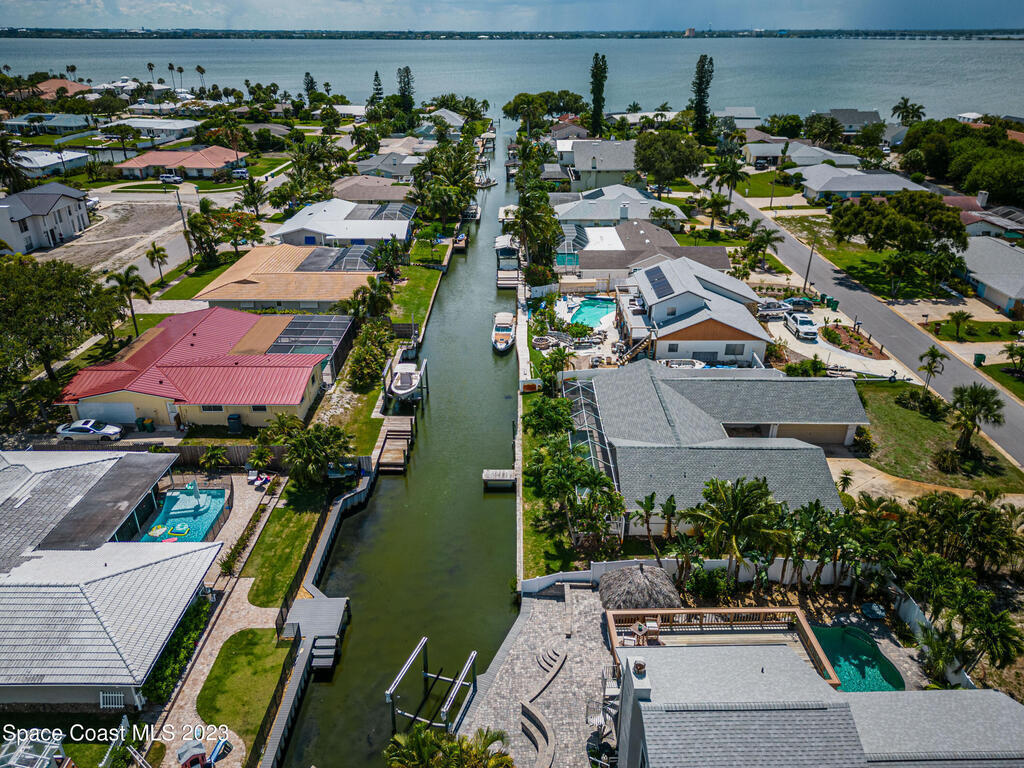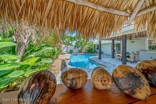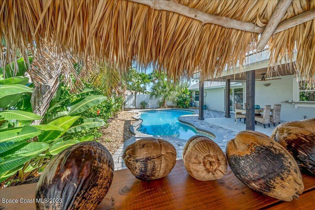 This impeccable canal front 3/3 split floor plan exudes Florida easy living! Enjoy tropical views from most windows and sliding french doors. The backyard boasts a sparkling beach entry pool to enjoy customized seating, a freestanding in ground hot tub and a timeless newly thatched tiki with ample electricity. Beautiful pavers lead you down to the sea-foam glass gas fire pit where you can watch gorgeous sunsets! The 9000 lbs boat lift awaits and provides quick access to the Indian River and ocean! Spacious primary suite, privately located upstairs has panoramic water views with a balcony and 2 oversized closets. This home prides itself with a 2020 roof, foam insulation and kitchen with ample storage. Take a short walk, bicycle or golf cart ride to Paradise Beach, restaurants and more!