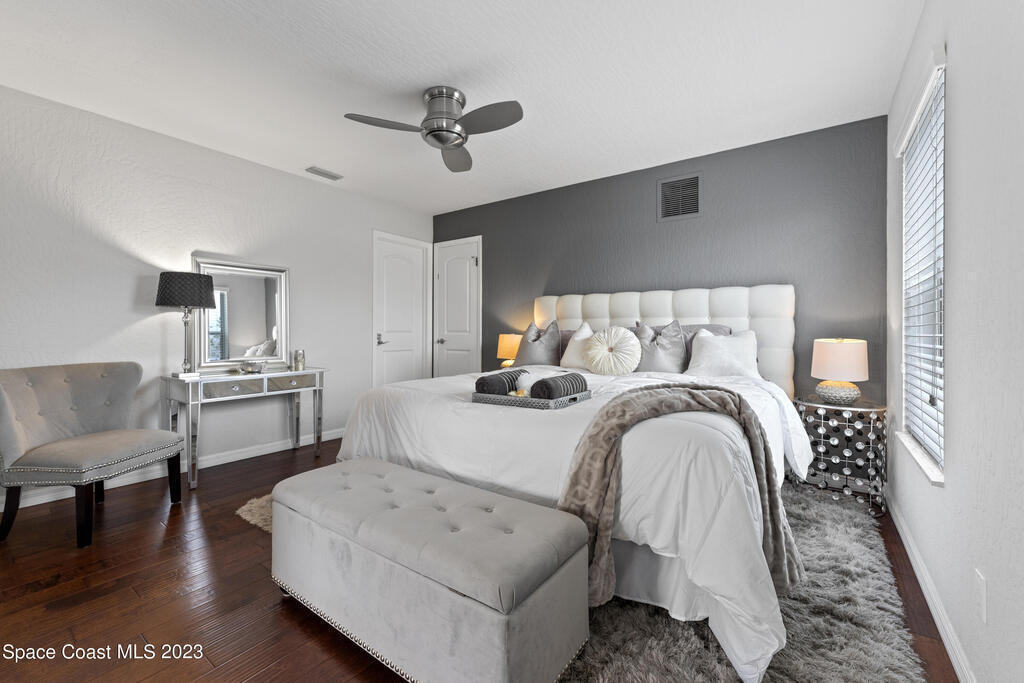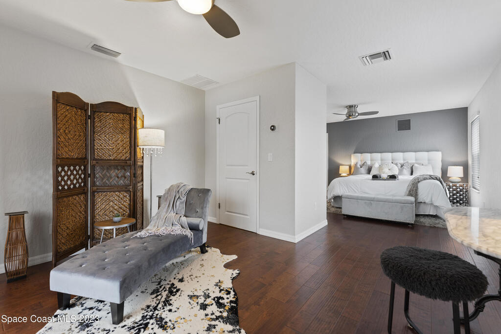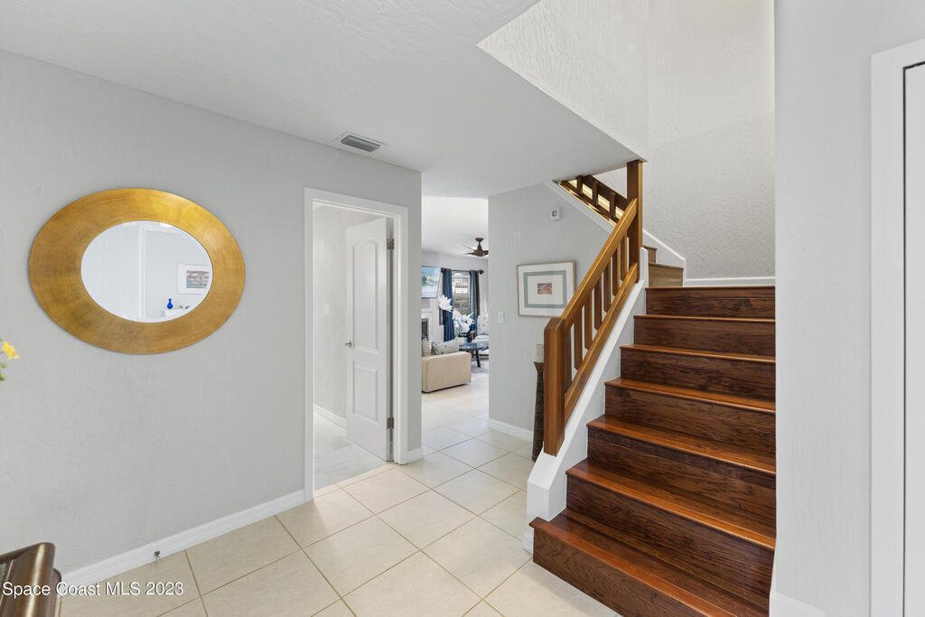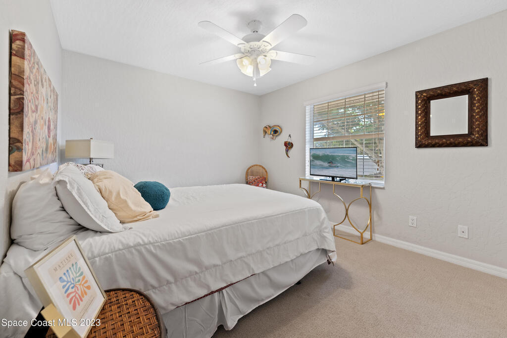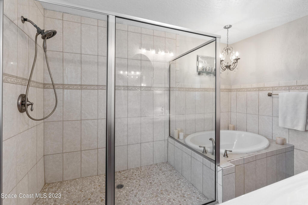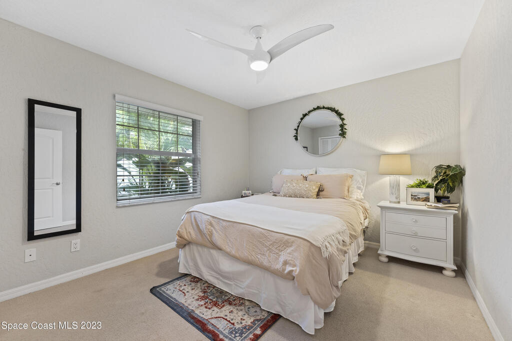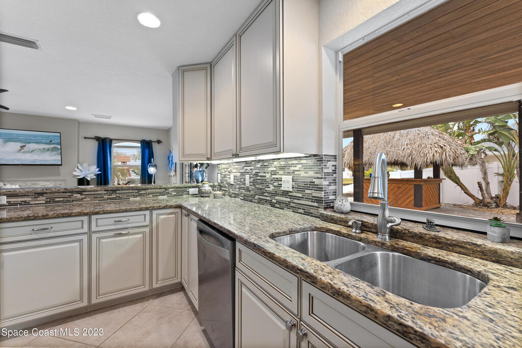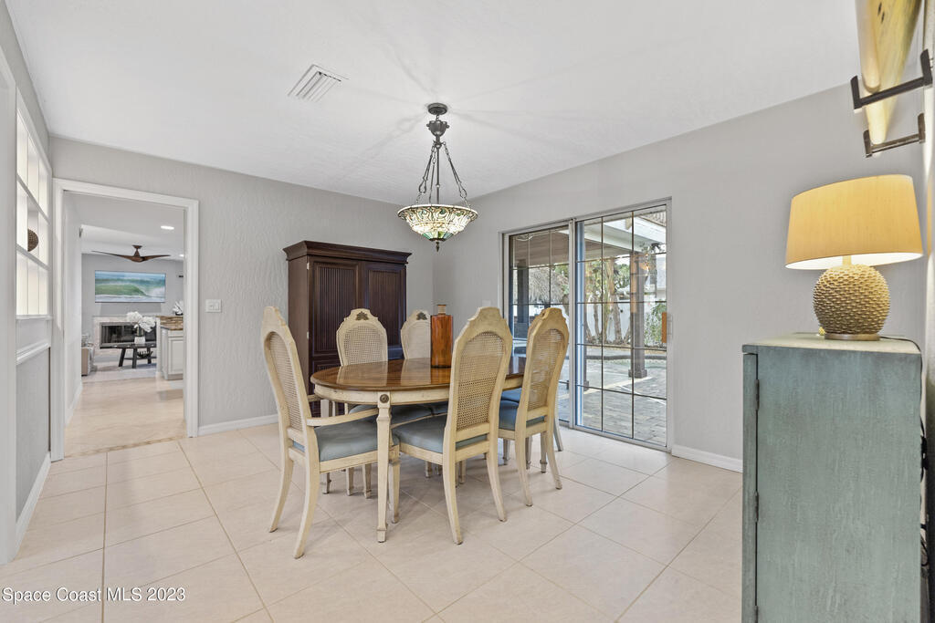 This impeccable canal front 3/3 split floor plan exudes Florida easy living! Enjoy tropical views from most windows and sliding french doors. The backyard boasts a sparkling beach entry pool to enjoy customized seating, a freestanding in ground hot tub and a timeless newly thatched tiki with ample electricity. Beautiful pavers lead you down to the sea-foam glass gas fire pit where you can watch gorgeous sunsets! The 9000 lbs boat lift awaits and provides quick access to the Indian River and ocean! Spacious primary suite, privately located upstairs has panoramic water views with a balcony and 2 oversized closets. This home prides itself with a 2020 roof, foam insulation and kitchen with ample storage. Take a short walk, bicycle or golf cart ride to Paradise Beach, restaurants and more!