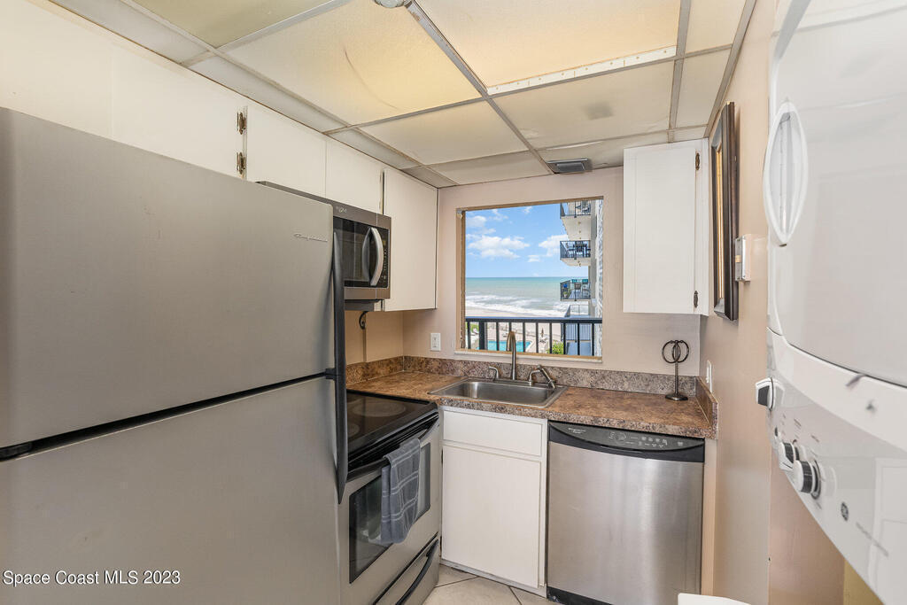 Welcome to your oceanfront haven! This 1-bedroom, 1-bathroom condo offers stunning ocean views, creating a serene coastal retreat. The interior boasts tile flooring and modern stainless steel appliances, combining functionality with style. With the luxury of double balconies, you can savor the ocean breeze from different angles. Convenience is at your fingertips with in-unit laundry. Embrace the coastal lifestyle with community amenities including a refreshing pool and direct beach access. Experience the perfect blend of comfort and seaside charm in this delightful oceanfront oasis. New Impact window in Bedroom (already installed) and New Impact window in kitchen to be installed on or about 9/22/23.
