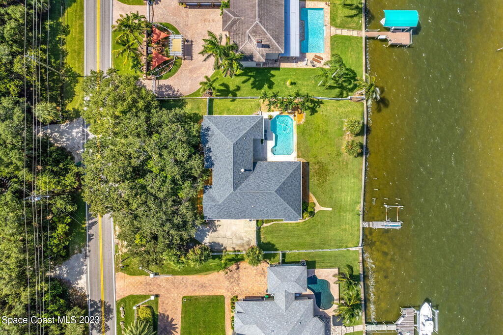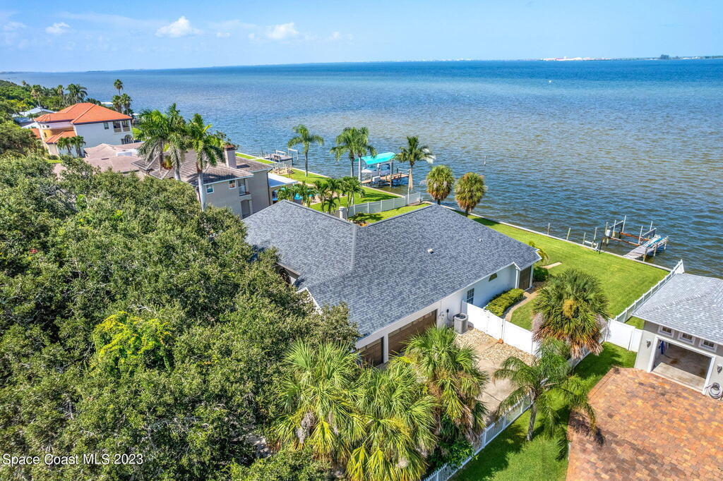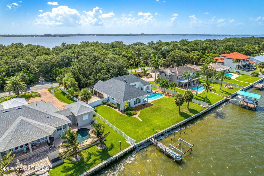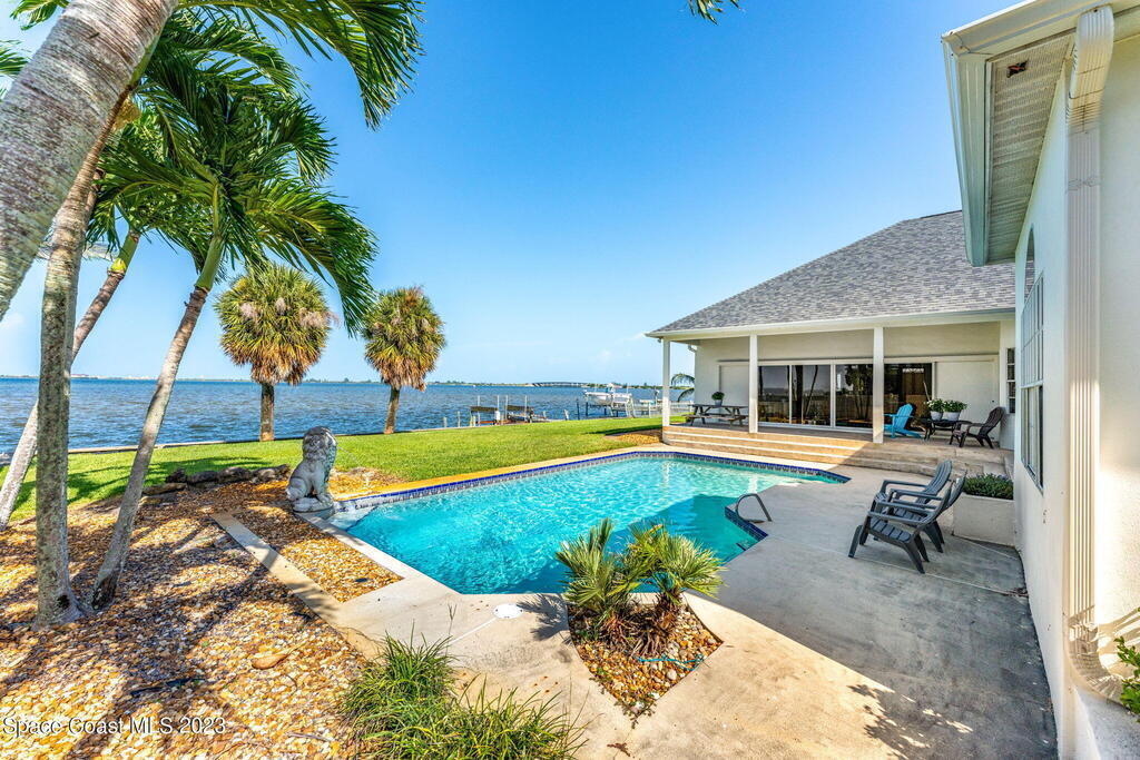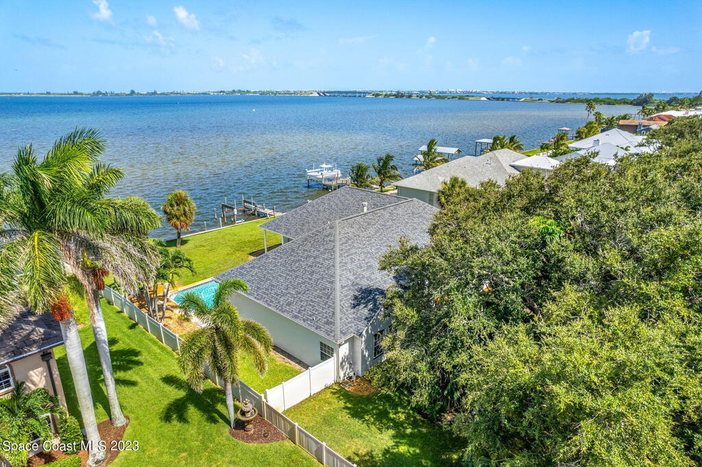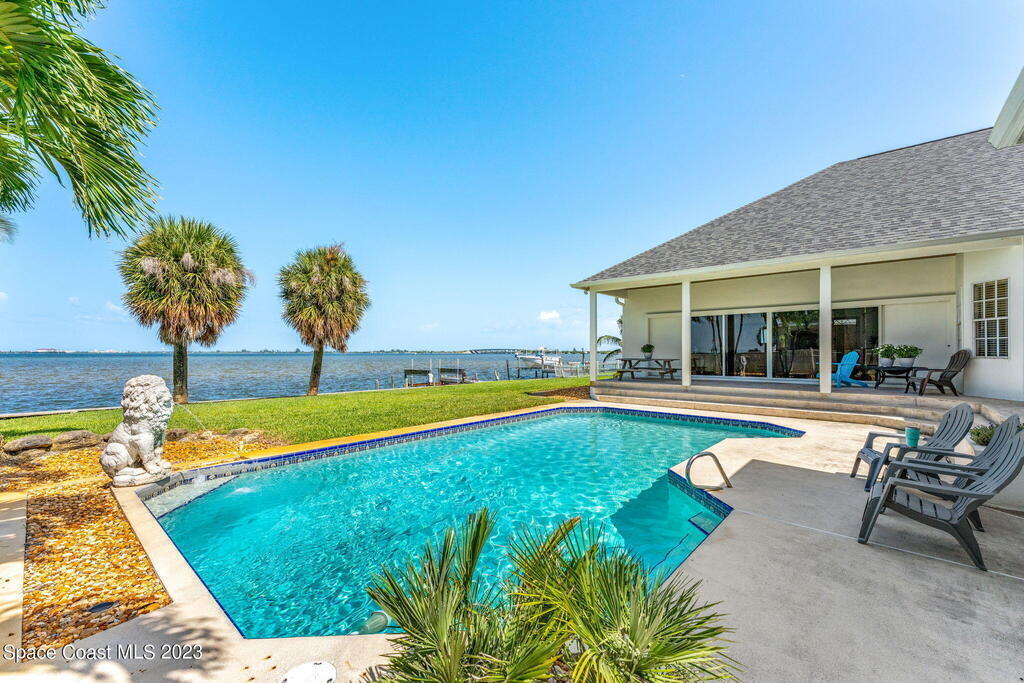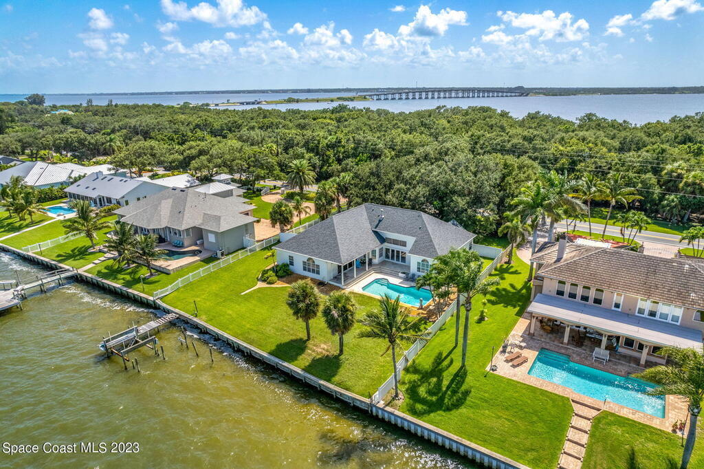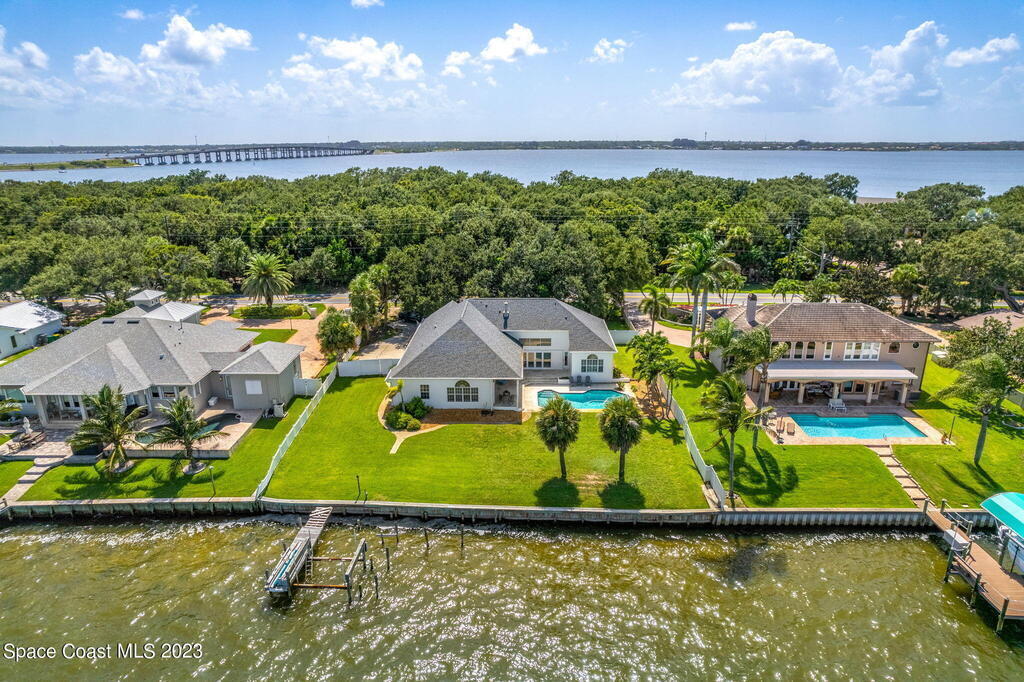 OVERLOOKING ONE OF THE WIDEST SPOTS ON THE BANANA RIVER & topped w/a 2019 roof! This half-acre beauty showcases a fountain pool, a big backyard, modern features & a coral stone fireplace. High ceilings crown hardwood & wood-look tile coursing through sunny living & dining, as walls of windows & glass doors open to an elevated patio & wondrous waterscapes. Granite, SS appliances & light wood cabinetry accent a bright b-fast bar kitchen. Charming bay-windowed casual dining offers lovely views. The owner's retreat flaunts gorgeous river vistas, patio access, a custom walk-in closet & a chic ensuite w/marbled stone sinks, a clawfoot tub & tiled shower w/pebbled flooring. The raised patio perches over a crystal-blue pool, the expansive backyard & broad Banana River scenes!